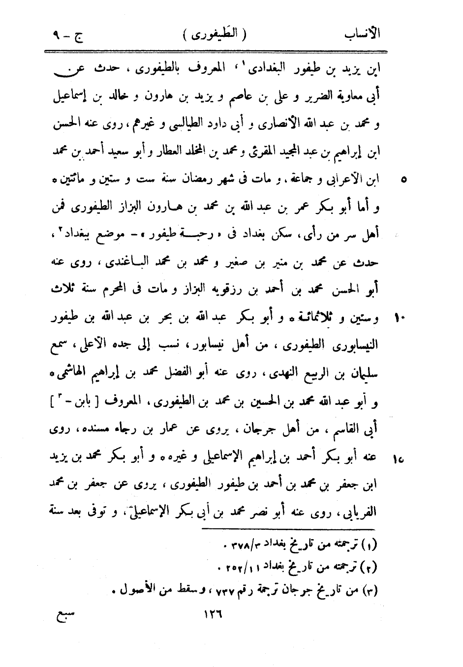 ابن يزيد بن طيفور البغدادي [1] ، المعروف بالطيفورى، حدث عن أبى معاوية الضرير وعلى بن عاصم ويزيد بن هارون وخالد بن إسماعيل ومحمد بن عبد الله الأنصاري وأبى داود الطيالسي وغيرهم، روى عنه الحسن ابن إبراهيم بن عبد المجيد المقرئ ومحمد بن المخلد العطار وأبو سعيد أحمد بن محمد ابن الأعرابي وجماعة، ومات في شهر رمضان سنة ست وستين ومائتين وأما أبو بكر عمر بن عبد الله بن محمد بن هارون البزاز الطيفورى فمن أهل سرمن رأى، سكن بغداد في «رحبة طيفور» - موضع ببغداد [2] ، حدث عن محمد بن منير بن صغير ومحمد بن محمد الباغندي، روى عنه أبو الحسن محمد بن أحمد بن رزقويه البزاز ومات في المحرم سنة ثلاث وستين وثلاثمائة وأبو بكر عبد الله بن بحر بن عبد الله بن طيفور النيسابورىّ الطيفورى، من أهل نيسابور، نسب إلى جده الأعلى، سمع سليمان بن الربيع النهدي، روى عنه أبو الفضل محمد بن إبراهيم الهاشمي وأبو عبد الله محمد بن الحسين بن محمد بن الطيفورى، المعروف [بابن-[3]] أبى القاسم، من أهل جرجان، يروى عن عمار بن رجاء مسندة، روى عنه أبو بكر أحمد بن إبراهيم الإسماعيلي وغيره وأبو بكر محمد بن يزيد ابن جعفر بن محمد بن أحمد بن طيفور الطيفورى، يروى عن جعفر بن محمد الفريابي، روى عنه أبو نصر محمد بن أبى بكر الإسماعيلي، وتوفى بعد سنة