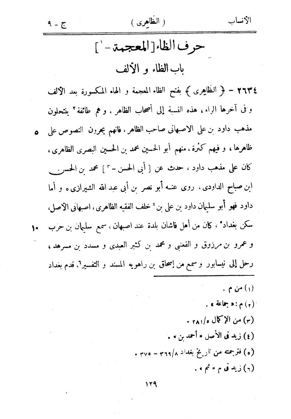 بفتح الظاء المعجمة والهاء المكسورة بعد الألف وفي آخرها الراء، هذه النسبة إلى أصحاب الظاهر، وهم طائفة [2] ينتحلون مذهب داود بن على الأصبهاني صاحب الظاهر، فإنهم يجرون النصوص على ظاهرها، وفيهم كثرة، منهم أبو الحسين محمد بن الحسين البصري الظاهري، كان على مذهب داود، حدث عن [أبى الحسن-[3]] محمد بن الحسن ابن صباح الداوديّ، روى عنه أبو نصر بن أبى عبد الله الشيرازي وأما داود فهو أبو سليمان داود بن على بن [4] خلف الفقيه الظاهري، أصبهاني الأصل، سكن بغداد [5] ، كان من أهل فاشان بلدة عند أصبهان، سمع سليمان بن حرب وعمرو بن مرزوق والقعنبي ومحمد بن كثير العبديّ ومسدد بن مسرهد، رحل إلى نيسابور وسمع من إسحاق بن راهويه المسند والتفسير [6] ، قدم بغداد