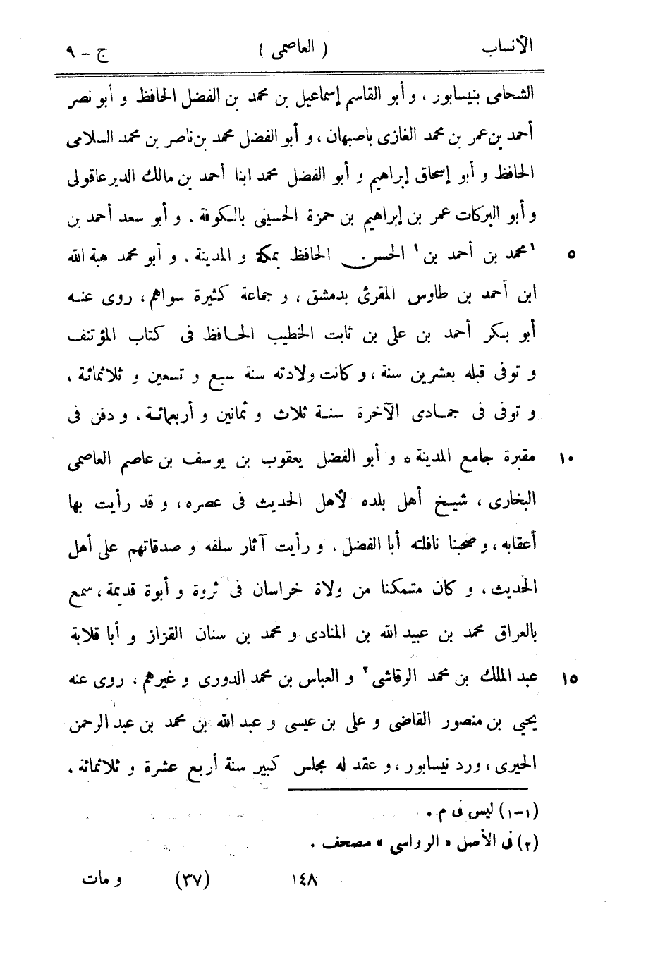 الشحامي بنيسابور، وأبو القاسم إسماعيل بن محمد بن الفضل الحافظ وأبو نصر أحمد بن عمر بن محمد الغازي بأصبهان، وأبو الفضل محمد بن ناصر بن محمد السلامي الحافظ وأبو إسحاق إبراهيم وأبو الفضل محمد ابنا أحمد بن مالك الديرعاقولي وأبو البركات عمر بن إبراهيم بن حمزة الحسيني بالكوفة، وأبو سعد أحمد بن [1] محمد بن أحمد بن [1] الحسن الحافظ بمكة والمدينة. وأبو محمد هبة الله ابن أحمد بن طاوس المقرئ بدمشق، وجماعة كثيرة سواهم، روى عنه أبو بكر أحمد بن على بن ثابت الخطيب الحافظ في كتاب المؤتنف وتوفى قبله بعشرين سنة، وكانت ولادته سنة سبع وتسعين وثلاثمائة، وتوفى في جمادى الآخرة سنة ثلاث وثمانين وأربعمائة، ودفن في مقبرة جامع المدينة وأبو الفضل يعقوب بن يوسف بن عاصم العاصمي البخاري، شيخ أهل بلده لأهل الحديث في عصره، وقد رأيت بها أعقابه، وصحبنا نافلته أبا الفضل، ورأيت آثار سلفه وصدقاتهم على أهل الحديث، وكان متمكنا من ولاة خراسان في ثروة وأبوة قديمة، سمع بالعراق محمد بن عبيد الله بن المنادي ومحمد بن سنان القزاز وأبا قلابة عبد الملك بن محمد الرقاشيّ [2] والعباس بن محمد الدوري وغيرهم، روى عنه يحيى بن منصور القاضي وعلى بن عيسى وعبد الله بن محمد بن عبد الرحمن الحيريّ، ورد نيسابور، وعقد له مجلس كبير سنة أربع عشرة وثلاثمائة،