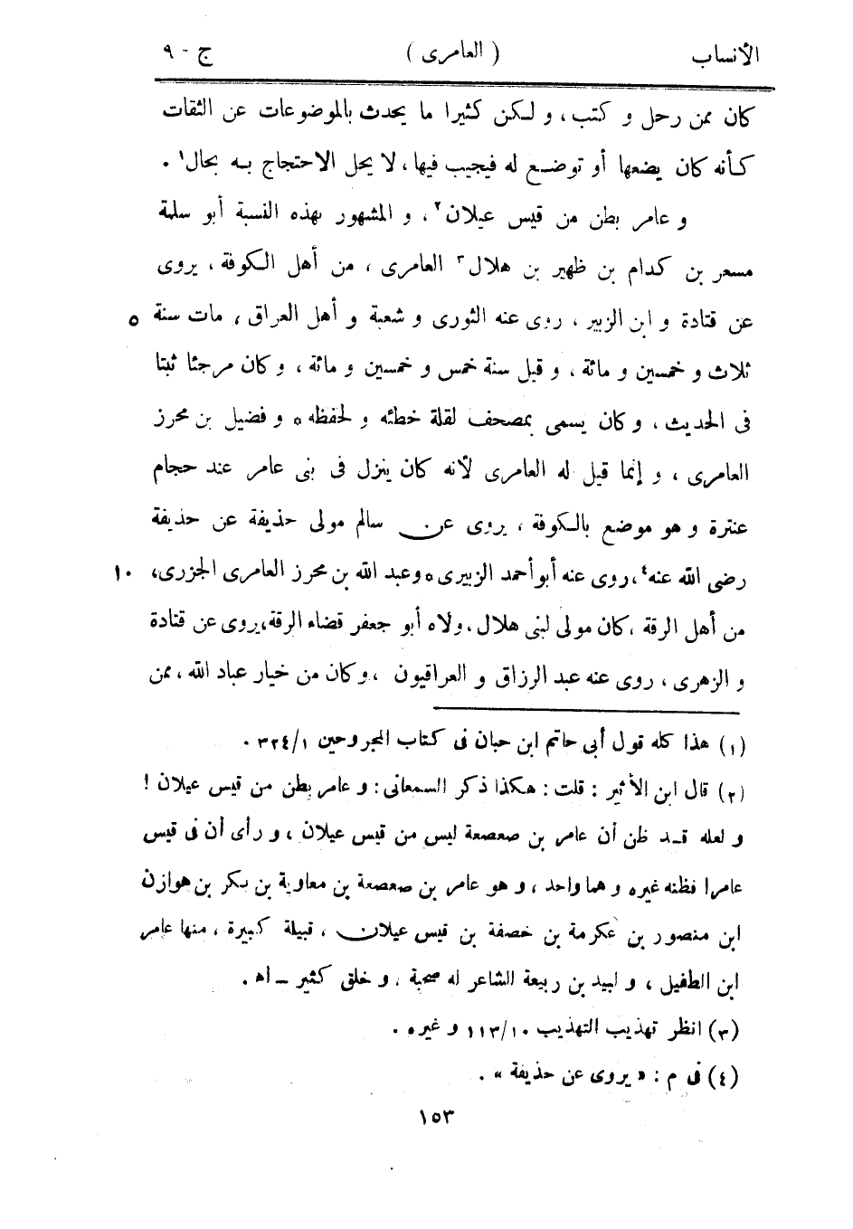 وعامر بطن من قيس عيلان [2] ، والمشهور بهذه النسبة أبو سلمة مسعر بن كدام بن ظهير بن هلال [3] العامري، من أهل الكوفة، يروى عن قتادة وابن الزبير، روى عنه الثوري وشعبة وأهل العراق، مات سنة ثلاث وخمسين ومائة، وقيل سنة خمس وخمسين ومائة، وكان مرجئا ثبتا في الحديث، وكان يسمى بمصحف لقلة خطئه ولحفظه وفضيل بن محرز العامري، وإنما قيل له العامري لأنه كان ينزل في بنى عامر عند حجام عنترة وهو موضع بالكوفة، يروى عن سالم مولى حذيفة عن حذيفة رضى الله عنه [4] ، روى عنه أبو أحمد الزبيري وعبد الله بن محرز العامري الجزري، من أهل الرقة، كان مولى لبني هلال، ولاه أبو جعفر قضاء الرقة، يروى عن قتادة والزهري، روى عنه عبد الرزاق والعراقيون، وكان من خيار عباد الله، ممن