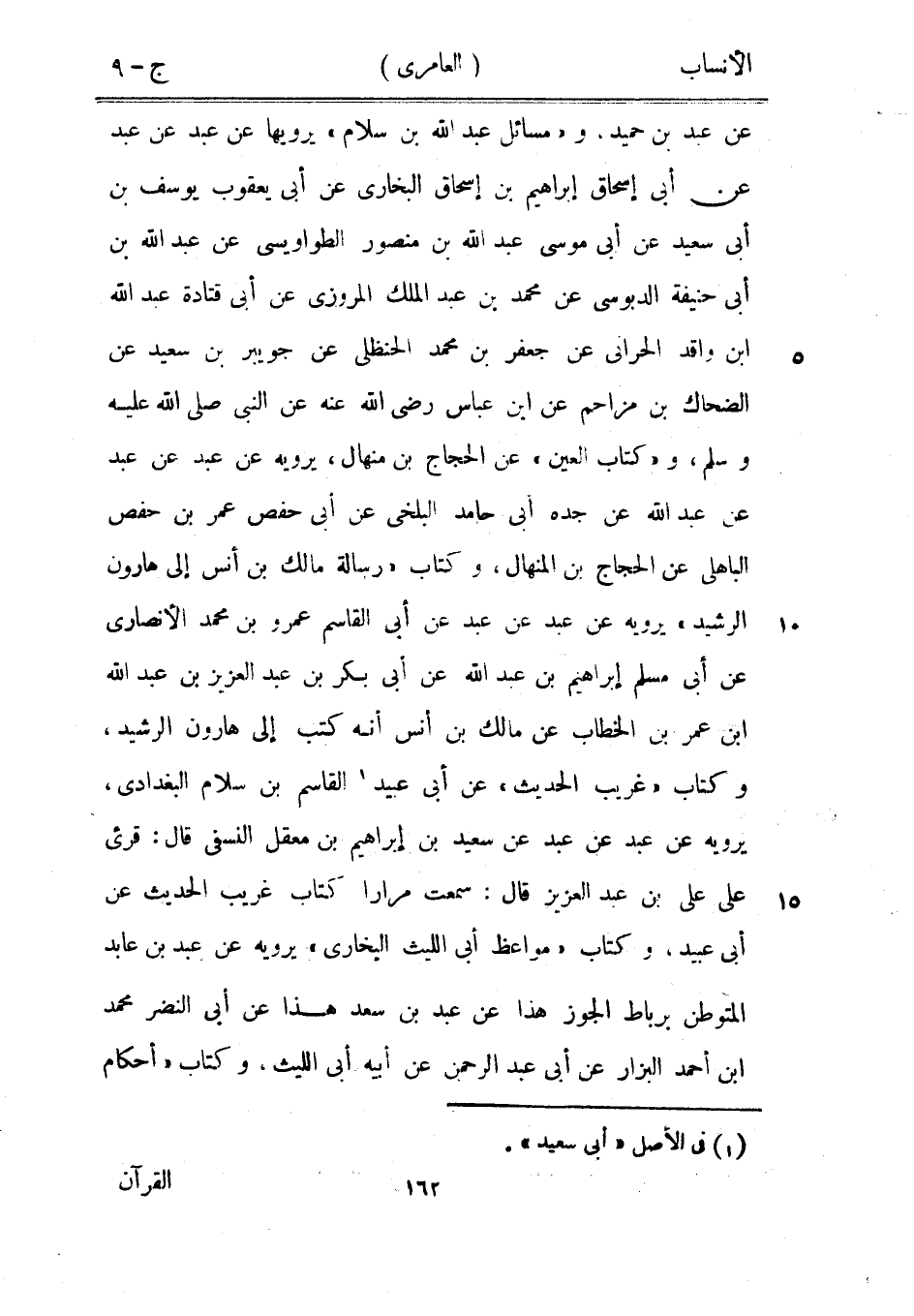 عن عبد بن حميد. و «مسائل عبد الله بن سلام» يرويها عن عبد عن عبد عن أبى إسحاق إبراهيم بن إسحاق البخاري عن أبى يعقوب يوسف بن أبى سعيد عن أبى موسى عبد الله بن منصور الطواويسى عن عبد الله بن أبى حنيفة الدبوسي عن محمد بن عبد الملك المروزي عن أبى قتادة عبد الله ابن واقد الحراني عن جعفر بن محمد الحنظليّ عن جويبر بن سعيد عن الضحاك بن مزاحم عن ابن عباس رضى الله عنه عن النبي صلى الله عليه وسلم، و «كتاب العين» عن الحجاج بن منهال، يرويه عن عبد عن عبد عن عبد الله عن جده أبى حامد البلخي عن أبى حفص عمر بن حفص الباهلي عن الحجاج بن المنهال، وكتاب «رسالة مالك بن أنس إلى هارون الرشيد» يرويه عن عبد عن عبد عن أبى القاسم عمرو بن محمد الأنصاري عن أبى مسلم إبراهيم بن عبد الله عن أبى بكر بن عبد العزيز بن عبد الله ابن عمر بن الخطاب عن مالك بن أنس أنه كتب إلى هارون الرشيد، وكتاب «غريب الحديث» عن أبى عبيد [1] القاسم بن سلام البغدادي، يرويه عن عبد عن عبد عن سعيد بن إبراهيم بن معقل النسفي قال: قرئ على على بن عبد العزيز قال: سمعت مرارا كتاب غريب الحديث عن أبى عبيد، وكتاب «مواعظ أبى الليث البخاري» يرويه عن عبد بن عابد المتوطن برباط الجوز هذا عن عبد بن سعد هذا عن أبى النضر محمد ابن أحمد البزار عن أبى عبد الرحمن عن أبيه أبى الليث، وكتاب «أحكام