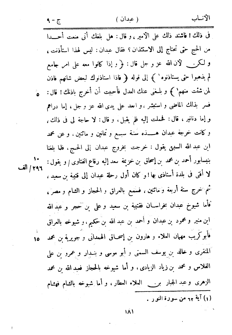 لا أفتى في بلدة أستاذى بها! وكان أول رحلة عبدان إلى قتيبة بن سعيد، 296/ ألف ثم خرج سنة أربعة ومائتين، فسمع بالعراق والحجاز والشام ومصر، فأما شيوخ عبدان بخراسان فقتيبة بن سعيد وعلى بن حجر وعبد الله ابن منير ومحمود بن عبدان وأحمد بن عبد الله بن حكيم، وشيوخه بالعراق فأبو كريب مهمان العلاء وهارون بن إسحاق الهمدانيّ وجويرية بن محمد المنقري وخالد بن يوسف السمتى وأبو موسى وبندار وعمرو بن على الفلاس ومحمد بن زياد الزيادي، وأما شيوخه بالحجاز فعبد الله بن محمد الزهري وعبد الجبار بن العلاء العطار، وأما شيوخه بالشام فهشام
