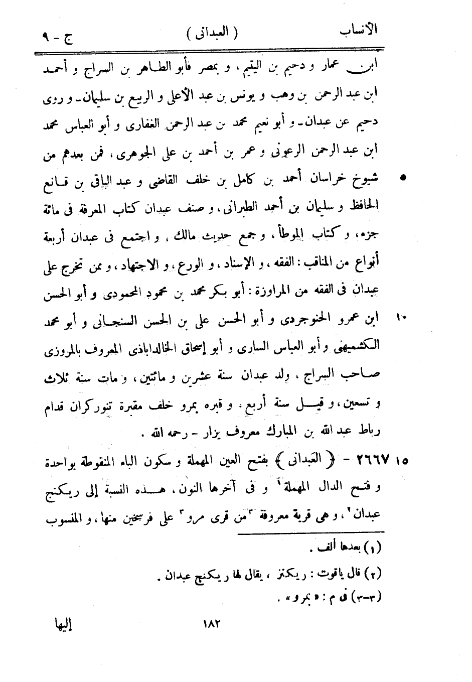 ابن عمار ودحيم بن اليتيم، وبمصر فأبو الطاهر بن السراج وأحمد ابن عبد الرحمن بن وهب ويونس بن عبد الأعلى والربيع بن سليمان- وروى دحيم عن عبدان- وأبو نعيم محمد بن عبد الرحمن الغفاريّ وأبو العباس محمد ابن عبد الرحمن الرعونى وعمر بن أحمد بن على الجوهري، فمن بعدهم من شيوخ خراسان أحمد بن كامل بن خلف القاضي وعبد الباقي بن قانع الحافظ وسليمان بن أحمد الطبراني، وصنف عبدان كتاب المعرفة في مائة جزء، وكتاب الموطأ، وجمع حديث مالك، واجتمع في عبدان أربعة أنواع من المناقب: الفقه، والإسناد، والورع، والاجتهاد، وممن تخرج على عبدان في الفقه من المراوزة: أبو بكر محمد بن محمود المحمودي وأبو الحسن ابن عمرو الحنوجردى وأبو الحسن على بن الحسن السنجاني وأبو محمد الكشميهني وأبو العباس الساري وأبو إسحاق الخالدآباذي المعروف بالمروزي صاحب السراج، ولد عبدان سنة عشرين ومائتين، ومات سنة ثلاث وتسعين، وقيل سنة أربع، وقبره بمرو خلف مقبرة تنوركران قدام رباط عبد الله بن المبارك معروف يزار- رحمه الله.