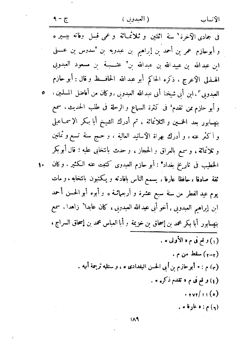 في جمادى الآخرة [1] سنة اثنتين وثلاثمائة وعمى قبل وفاته بيسير وأبو حازم عمر بن أحمد بن إبراهيم بن عبدويه بن [2] سدوس بن على ابن عبد الله بن عبيد الله بن عبد الله بن [2] عتبة بن مسعود العبدويى الهذلي الأعرج، ذكره الحاكم أبو عبد الله الحافظ وقال: أبو حازم العبدويى [3] ، ابن أبى شيخنا أبى عبد الله العبدويى، وكان من أفاضل المسلمين، وأبو حازم ممن تقدم [4] في كثرة السماع والرحلة في طلب الحديث، سمع بنيسابور بعد الخمسين والثلاثمائة، ثم أدرك الشيخ أبا بكر الإسماعيلي وأكثر عنه، وأدرك بهراة الأسانيد العالية، وحج سنة تسع وثمانين وثلاثمائة، وسمع بالعراق والحجاز، وحدث بانتخابى عليه، قال أبو بكر الخطيب في تاريخ بغداد [5] : أبو حازم العبدوي كتبت عنه الكثير، وكان ثقة صادقا، حافظا عارفا، يسمع الناس بافادته ويكتبون بانتخابه، ومات يوم عيد الفطر من سنة سبع عشرة وأربعمائة وأبوه أبو الحسن أحمد ابن إبراهيم العبدويى، أخو أبى عبد الله العبدويى، كان عابدا [6] زاهدا، سمع بنيسابور أبا بكر محمد بن إسحاق بن خزيمة وأبا العباس محمد بن إسحاق السراج،