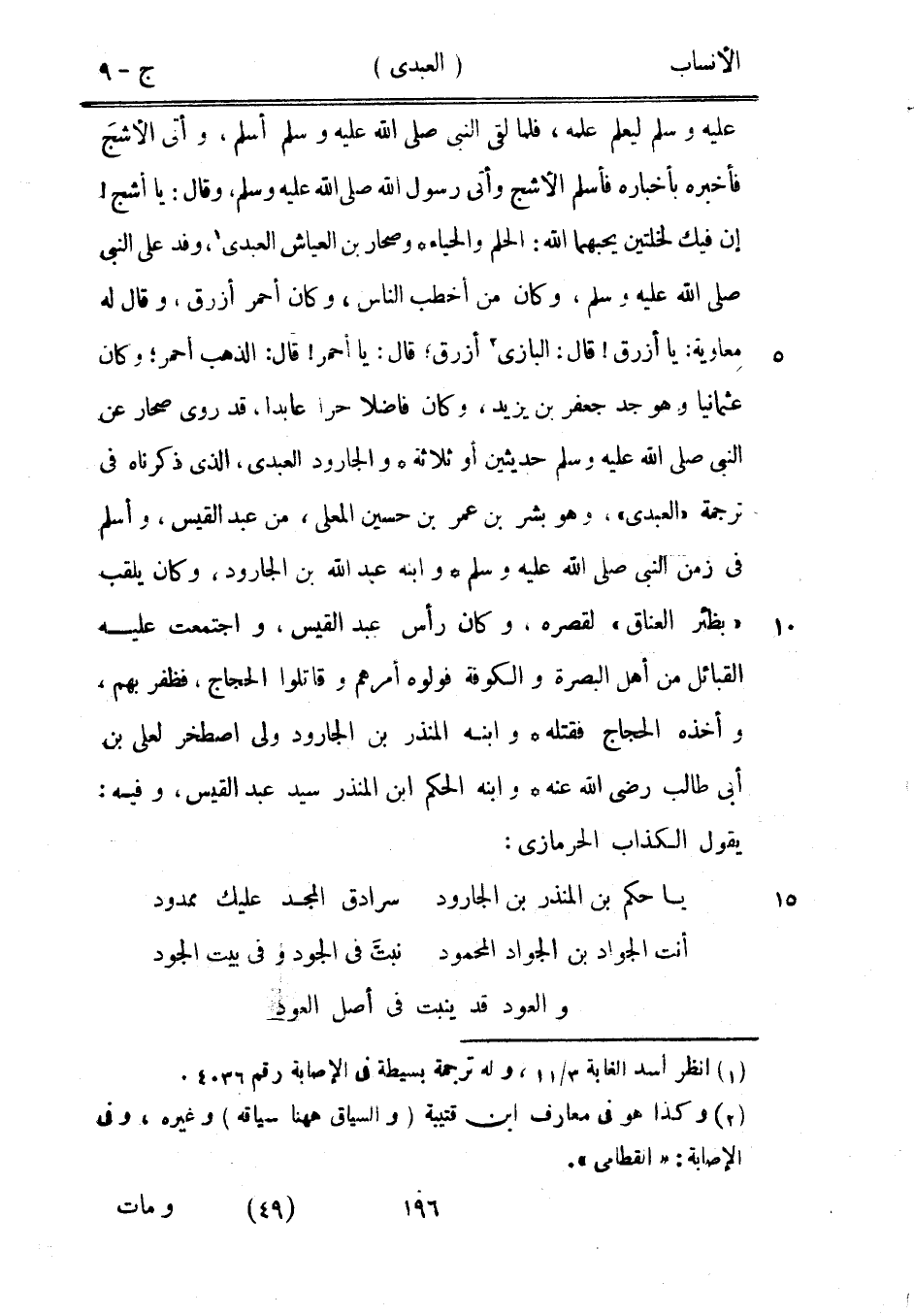 عليه وسلم ليعلم علمه، فلما لقي النبي صلى الله عليه وسلم أسلم، وأتى الأشج فأخبره بأخباره فأسلم الأشج وأتى رسول الله صلى الله عليه وسلم، وقال: يا أشج! إن فيك لخلتين يحبهما الله: الحلم والحياء وصحار بن العياش العبديّ [1] ، وفد على النبي صلى الله عليه وسلم، وكان من أخطب الناس، وكان أحمر أزرق، وقال له معاوية: يا أزرق! قال: البازي [2] أزرق، قال: يا أحمر! قال: الذهب أحمر، وكان عثمانيا وهو جد جعفر بن يزيد، وكان فاضلا حرا عابدا، قد روى صحار عن النبي صلى الله عليه وسلم حديثين أو ثلاثة والجارود العبديّ، الّذي ذكرناه في ترجمة «العبديّ» ، وهو بشر بن عمر بن حسين المعلى، من عبد القيس، وأسلم في زمن النبي صلى الله عليه وسلم وابنه عبد الله بن الجارود، وكان يلقب «بظئر العناق» لقصره، وكان رأس عبد القيس، واجتمعت عليه القبائل من أهل البصرة والكوفة فولوه أمرهم وقاتلوا الحجاج، فظفر بهم، وأخذه الحجاج فقتله وابنه المنذر بن الجارود ولى إصطخر لعلى بن أبى طالب رضى الله عنه وابنه الحكم ابن المنذر سيد عبد القيس، وفيه: