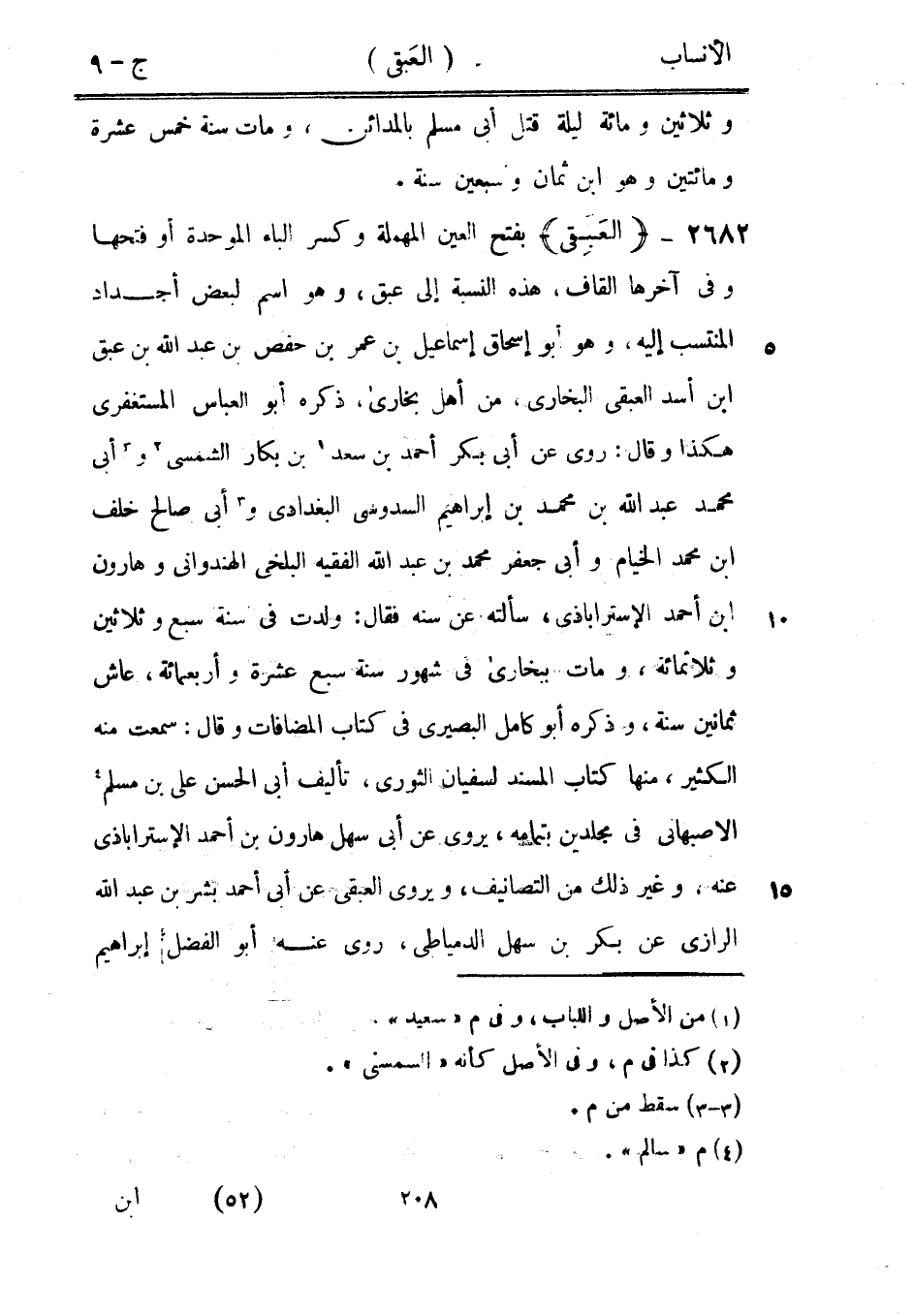 بفتح العين المهملة وكسر الباء الموحدة أو فتحها وفي آخرها القاف، هذه النسبة إلى عبق، وهو اسم لبعض أجداد المنتسب إليه، وهو أبو إسحاق إسماعيل بن عمر بن حفص بن عبد الله بن عبق ابن أسد العبقى البخاري، من أهل بخارى، ذكره أبو العباس المستغفري هكذا وقال: روى عن أبى بكر أحمد بن سعد [1] بن بكار الشمسى [2] و [3] أبى محمد عبد الله بن محمد بن إبراهيم السدوسي البغدادي و [4] أبى صالح خلف ابن محمد الخيام وأبى جعفر محمد بن عبد الله الفقيه البلخي الهندواني وهارون ابن أحمد الأستراباذي، سألته عن سنه فقال: ولدت في سنة سبع وثلاثين وثلاثمائة، ومات ببخارى في شهور سنة سبع عشرة وأربعمائة، عاش ثمانين سنة، وذكره أبو كامل البصيري في كتاب المضافات وقال: سمعت منه الكثير، منها كتاب المسند لسفيان الثوري، تأليف أبى الحسن على بن مسلم الأصبهاني في مجلدين بتمامه، يروى عن أبى سهل هارون بن أحمد الأستراباذي عنه. وغير ذلك من التصانيف، ويروى العبقى عن أبى أحمد بشر بن عبد الله الرازيّ عن بكر بن سهل الدمياطيّ، روى عنه أبو الفضل إبراهيم