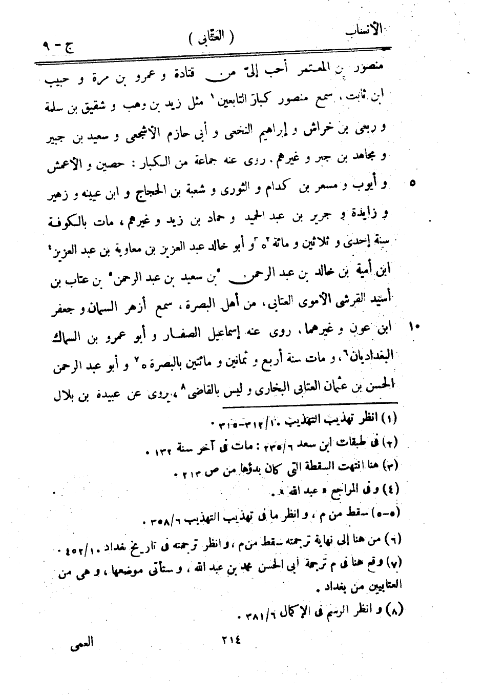 منصور بن المعتمر أحب إليّ من قتادة وعمرو بن مرة وحبيب ابن ثابت، سمع منصور كبار التابعين [1] مثل زيد بن وهب وشقيق بن سلمة وربعي بن خراش وإبراهيم النخعي وأبى حازم الأشجعي وسعيد بن جبير ومجاهد بن جبر وغيرهم، روى عنه جماعة من الكبار: حصين والأعمش وأيوب ومسعر بن كدام والثوري وشعبة بن الحجاج وابن عيينة وزهير وزائدة وجرير بن عبد الحميد وحماد بن زيد وغيرهم، مات بالكوفة سنة إحدى وثلاثين ومائة [2] [3] وأبو خالد عبد العزيز بن معاوية بن عبد العزيز [4] ابن أمية بن خالد بن عبد الرحمن [5] بن سعيد بن عبد الرحمن [5] بن عتاب بن أسيد القرشي الأموي العتابى، من أهل البصرة، سمع أزهر السمان وجعفر ابن عون وغيرهما، روى عنه إسماعيل الصفار وأبو عمرو بن السماك البغداديان [6] ، ومات سنة أربع وثمانين ومائتين بالبصرة [7] وأبو عبد الرحمن الحسن بن عثمان العتابى البخاري وليس بالقاضي [8] ، يروى عن عبيدة بن بلال