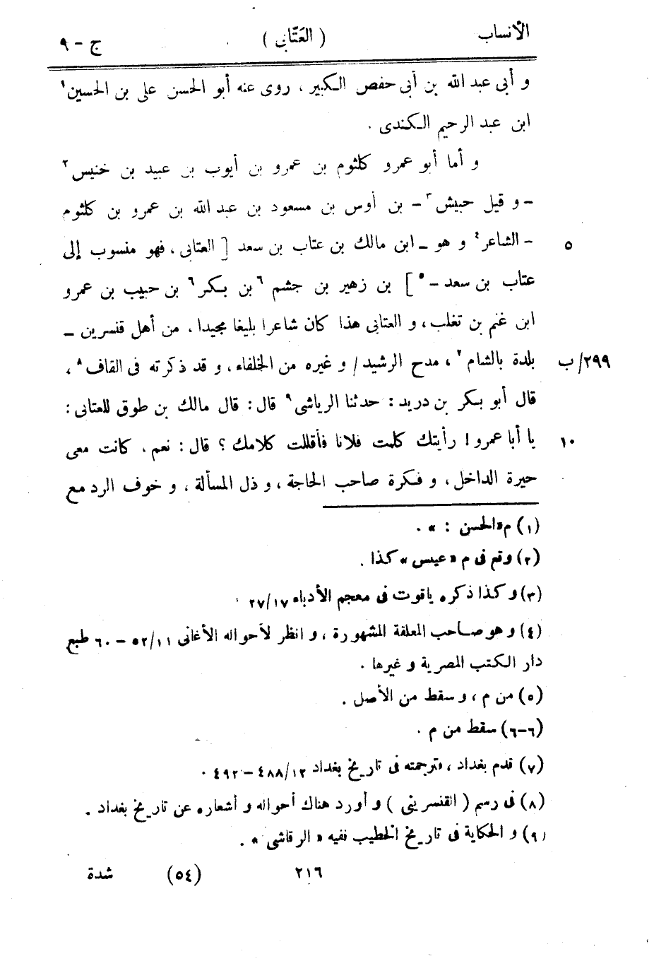 وأما أبو عمرو كلثوم بن عمرو بن أيوب بن عبيد بن خنيس [2]- وقيل حبيش [3]- بن أوس بن مسعود بن عبد الله بن عمرو بن كلثوم- الشاعر [4] وهو- ابن مالك بن عتاب بن سعد [العتابى، فهو منسوب إلى عتاب بن سعد-[5]] بن زهير بن جشم [6] بن بكر [6] بن حبيب بن عمرو ابن غنم بن تغلب، والعتابى هذا كان شاعرا بليغا مجيدا، من أهل قنسرين- 299/ ب بلدة بالشام [7] ، مدح الرشيد/ وغيره من الخلفاء، وقد ذكرته في القاف [8] ، قال أبو بكر بن دريد: حدثنا الرياشي [9] قال: قال مالك بن طوق للعتابى: