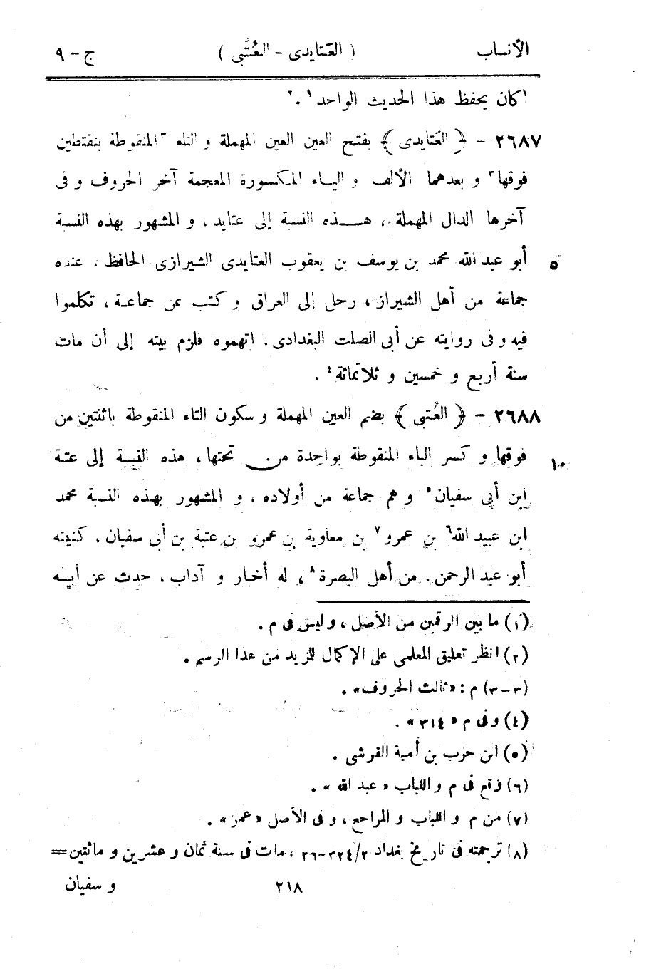 بضم العين المهملة وسكون التاء المنقوطة باثنتين من فوقها وكسر الباء المنقوطة بواحدة من تحتها، هذه النسبة إلى عتبة ابن أبى سفيان [5] وهم جماعة من أولاده، والمشهور بهذه النسبة محمد ابن عبيد الله [6] بن عمرو [7] بن معاوية بن عمرو بن عتبة بن أبى سفيان، كنيته أبو عبد الرحمن، من أهل البصرة [8] ، له أخبار وآداب، حدث عن أبيه