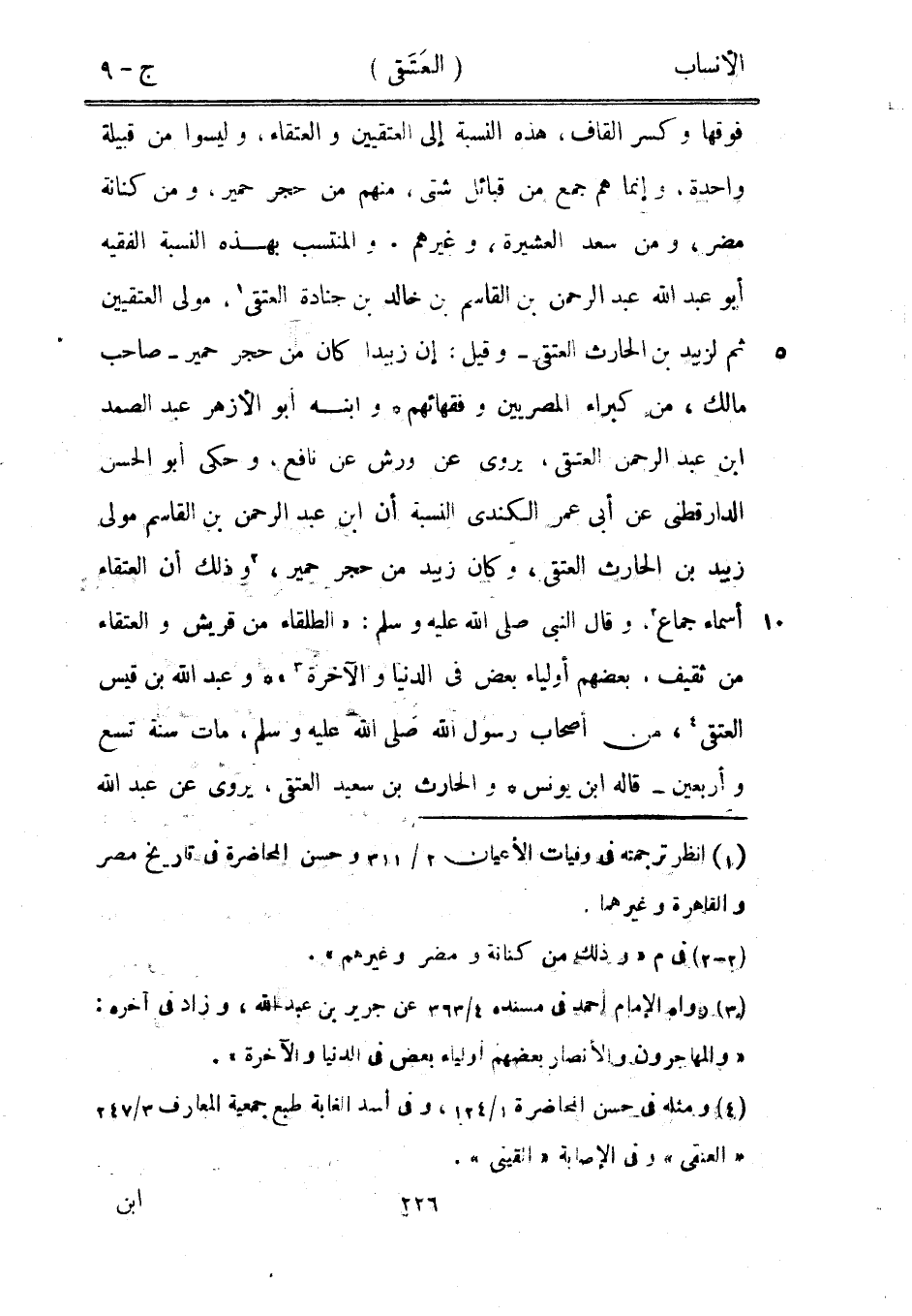 فوقها وكسر القاف، هذه النسبة إلى العتقيين والعتقاء، وليسوا من قبيلة واحدة، وإنما هم جمع من قبائل شتى، منهم من حجر حمير، ومن كنانة مضر، ومن سعد العشيرة، وغيرهم. والمنتسب بهذه النسبة الفقيه أبو عبد الله عبد الرحمن بن القاسم بن خالد بن جنادة العتقيّ [1] ، مولى العتقيين ثم لزبيد بن الحارث العتقيّ- وقيل: إن زبيدا كان من حجر حمير- صاحب مالك، من كبراء المصريين وفقهائهم وابنه أبو الأزهر عبد الصمد ابن عبد الرحمن العتقيّ، يروى عن ورش عن نافع، وحكى أبو الحسن الدار قطنى عن أبى عمر الكندي النسبة أن ابن عبد الرحمن بن القاسم مولى زبيد بن الحارث العتقيّ، وكان زبيد من حجر حمير، [2] وذلك أن العتقاء أسماء جماع [2] ، وقال النبي صلى الله عليه وسلم: «الطلقاء من قريش والعتقاء من ثقيف، بعضهم أولياء بعض في الدنيا والآخرة [3] » وعبد الله بن قيس العتقيّ [4] ، من أصحاب رسول الله صلى الله عليه وسلم، مات سنة تسع وأربعين- قاله ابن يونس والحارث بن سعيد العتقيّ، يروى عن عبد الله