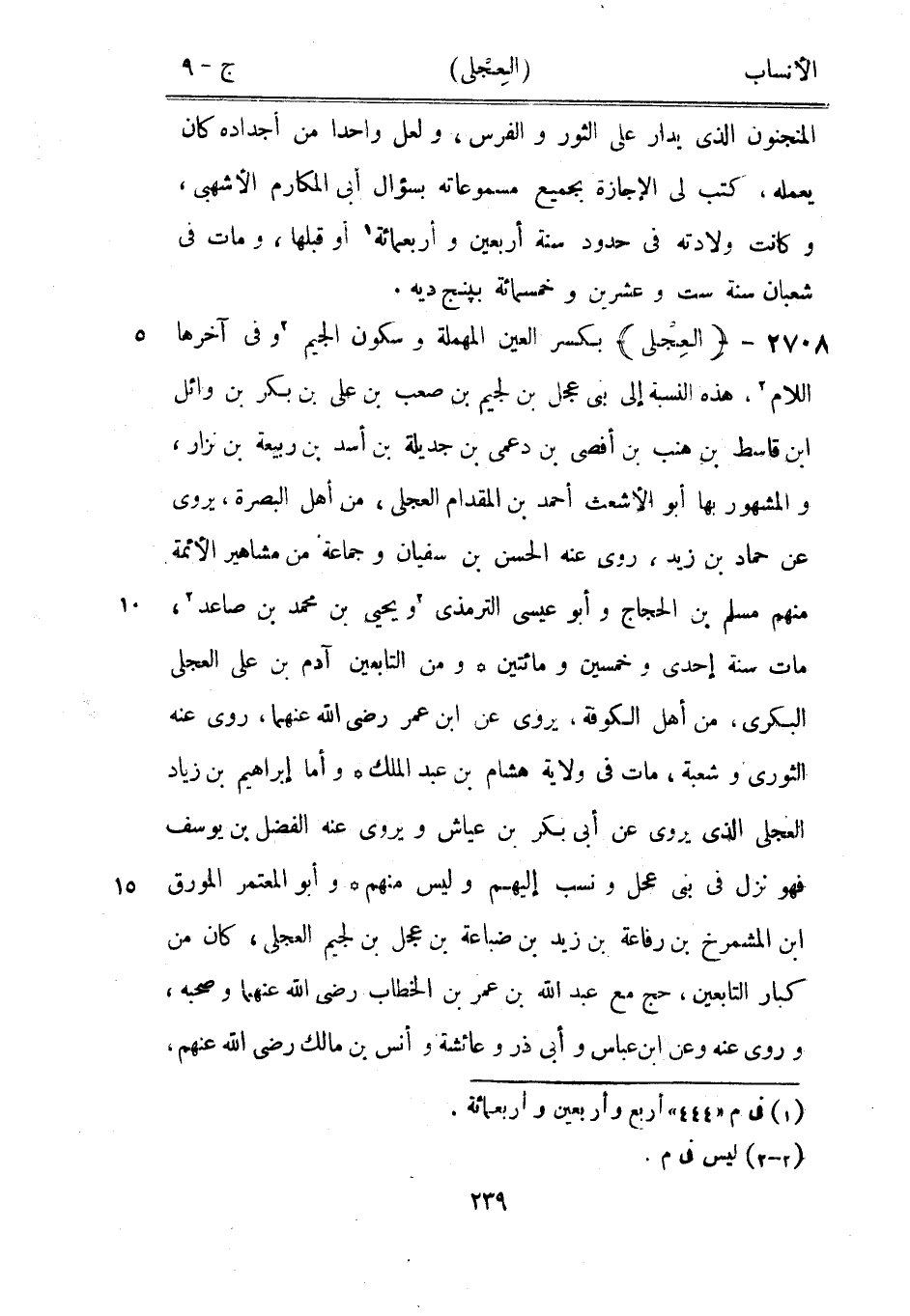بكسر العين المهملة وسكون الجيم [2] وفي آخرها اللام [2] ، هذه النسبة إلى بنى عجل بن لجيم بن صعب بن على بن بكر بن وائل ابن قاسط بن هنب بن أفصى بن دعمي بن جديلة بن أسد بن ربيعة بن نزار، والمشهور بها أبو الأشعث أحمد بن المقدام العجليّ، من أهل البصرة، يروى عن حماد بن زيد، روى عنه الحسن بن سفيان وجماعة من مشاهير الأئمة منهم مسلم بن الحجاج وأبو عيسى الترمذي [2] ويحيى بن محمد بن صاعد [2] ، مات سنة إحدى وخمسين ومائتين ومن التابعين آدم بن على العجليّ البكري، من أهل الكوفة، يروى عن ابن عمر رضى الله عنهما، روى عنه الثوري وشعبة، مات في ولاية هشام بن عبد الملك وأما إبراهيم بن زياد العجليّ الّذي يروى عن أبى بكر بن عياش ويروى عنه الفضل بن يوسف فهو نزل في بنى عجل ونسب إليهم وليس منهم وأبو المعتمر المورق ابن المشمرخ بن رفاعة بن زيد بن ضباعة بن عجل بن لجيم العجليّ، كان من كبار التابعين، حج مع عبد الله بن عمر بن الخطاب رضى الله عنهما وصحبه، وروى عنه وعن ابن عباس وأبى ذر وعائشة وأنس بن مالك رضى الله عنهم،