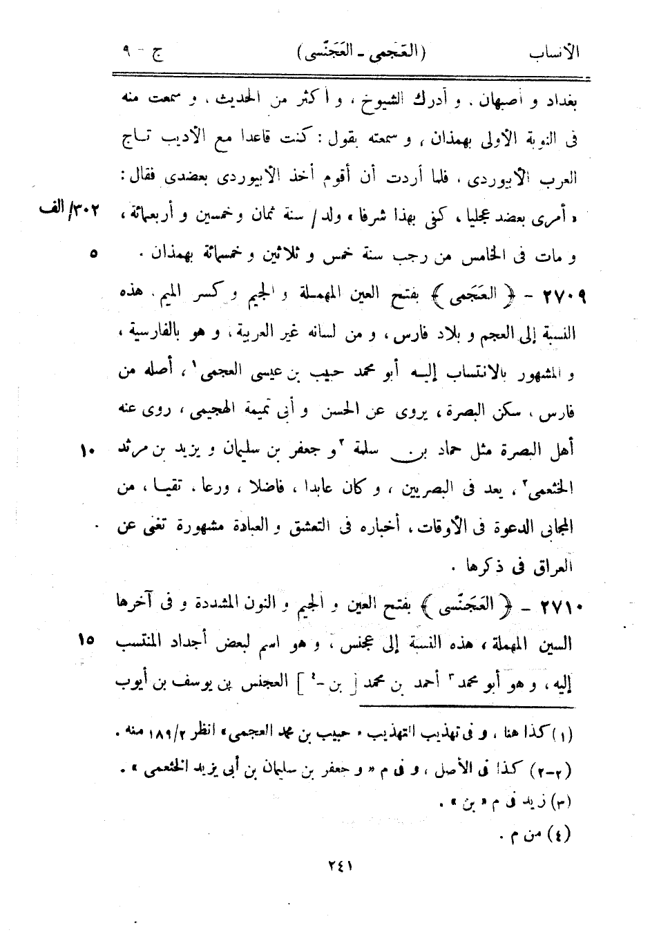بفتح العين المهملة والجيم وكسر الميم، هذه النسبة إلى العجم وبلاد فارس، ومن لسانه غير العربية، وهو بالفارسية، والمشهور بالانتساب إليه أبو محمد حبيب بن عيسى العجمي [1] ، أصله من فارس، سكن البصرة، يروى عن الحسن وأبى تميمة الهجيمي، روى عنه أهل البصرة مثل حماد بن سلمة [2] وجعفر بن سليمان ويزيد بن مرثد الخثعميّ [2] ، يعد في البصريين، وكان عابدا، فاضلا، ورعا، تقيا، من المجابي الدعوة في الأوقات، أخباره في التعشق والعبادة مشهورة تغني عن العراق في ذكرها.