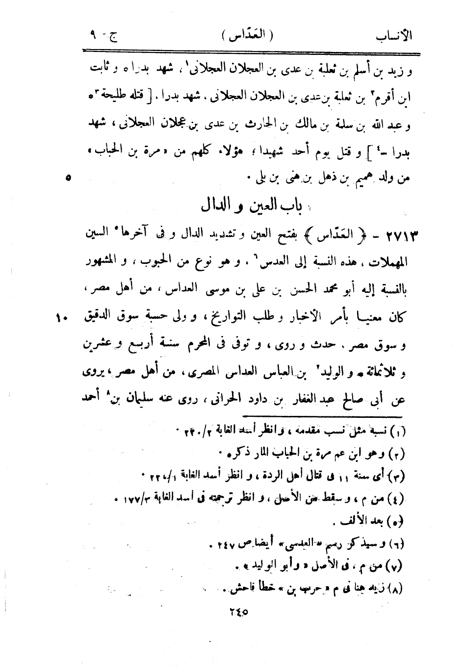 بفتح العين وتشديد الدال وفي آخرها [5] السين المهملات، هذه النسبة إلى العدس [6] ، وهو نوع من الحبوب، والمشهور بالنسبة إليه أبو محمد الحسن بن على بن موسى العداس، من أهل مصر، كان معنيا بأمر الأخبار وطلب التواريخ، وولى حسبة سوق الدقيق وسوق مصر، حدث وروى، وتوفى في المحرم سنة أربع وعشرين وثلاثمائة والوليد [7] بن العباس العداس المصري، من أهل مصر، يروى عن أبى صالح عبد الغفار بن داود الحراني، روى عنه سليمان بن [8] أحمد