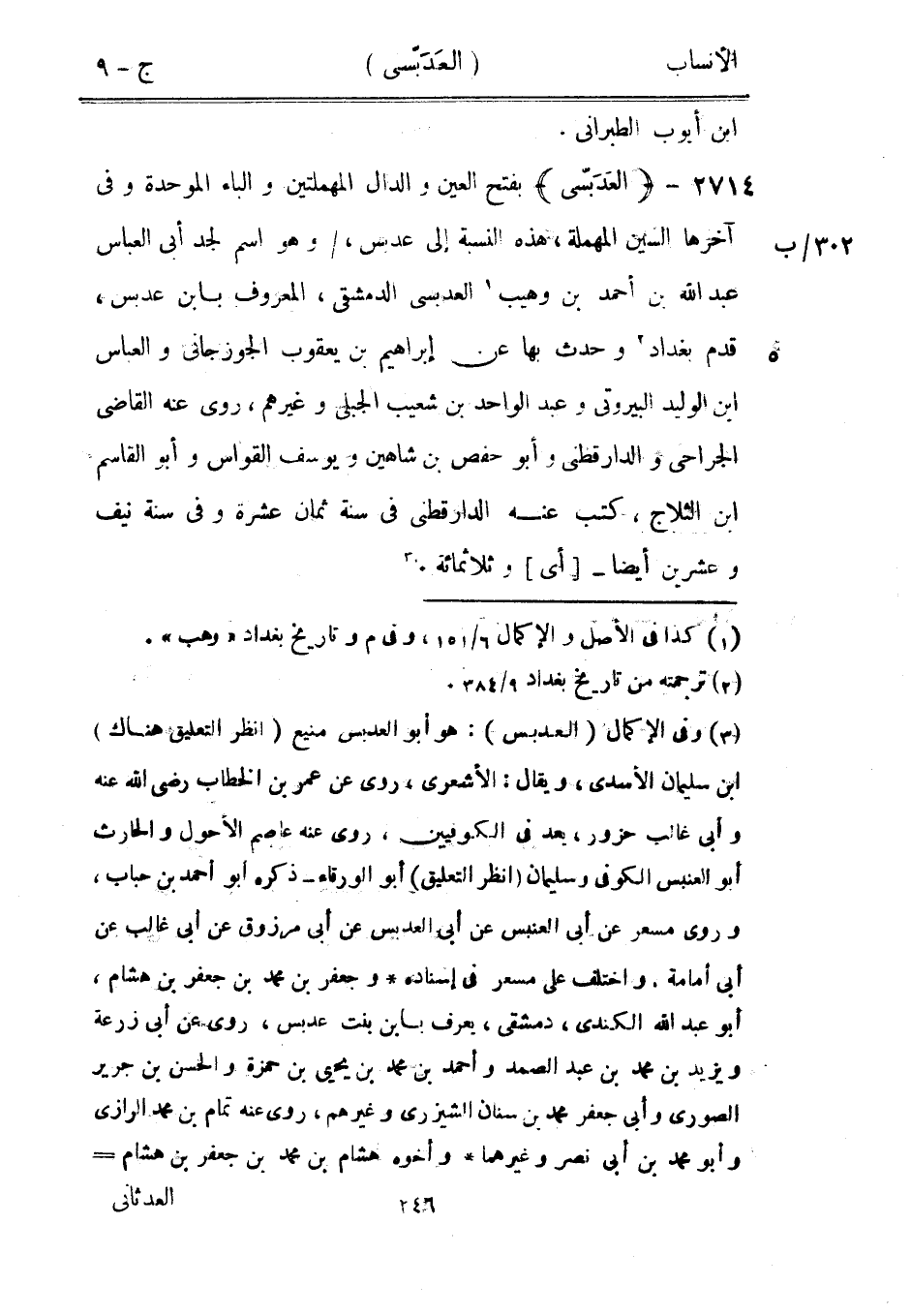 بفتح العين والدال المهملتين والباء الموحدة وفي 302/ ب آخرها السين المهملة، هذه النسبة إلى عدبس،/ وهو اسم لجد أبى العباس عبد الله بن أحمد بن وهيب [1] العدبسى الدمشقيّ، المعروف بابن عدبس، قدم بغداد [2] وحدث بها عن إبراهيم بن يعقوب الجوزجاني والعباس ابن الوليد البيروتي وعبد الواحد بن شعيب الجبليّ وغيرهم، روى عنه القاضي الجراحي والدار قطنى وأبو حفص بن شاهين ويوسف القواس وأبو القاسم ابن الثلاج، كتب عنه الدار قطنى في سنة ثمان عشرة وفي سنة نيف وعشرين أيضا-[أي] وثلاثمائة. [3]