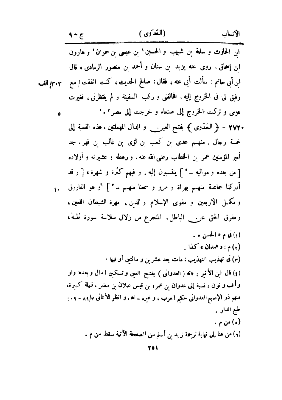 بفتح العين والدال المهملتين، هذه النسبة إلى خمسة رجال، منهم عدي بن كعب بن لؤيّ بن غالب بن فهر، جد أمير المؤمنين عمر بن الخطاب رضى الله عنه، ورهطه وعشيرته وأولاده [من بعده ومواليه-[5]] ينتسبون إليه، وفيهم كثرة وشهرة، [وقد أدركنا جماعة منهم بهراة ومرو وسمعنا منهم-[5]] [6] وهو الفاروق ومكمل الأربعين ومقوى الإسلام والدين، مهرة الشيطان اللعين، ومفرق الحق عن الباطل، المتجرع من زلال سلاسة سورة طه،