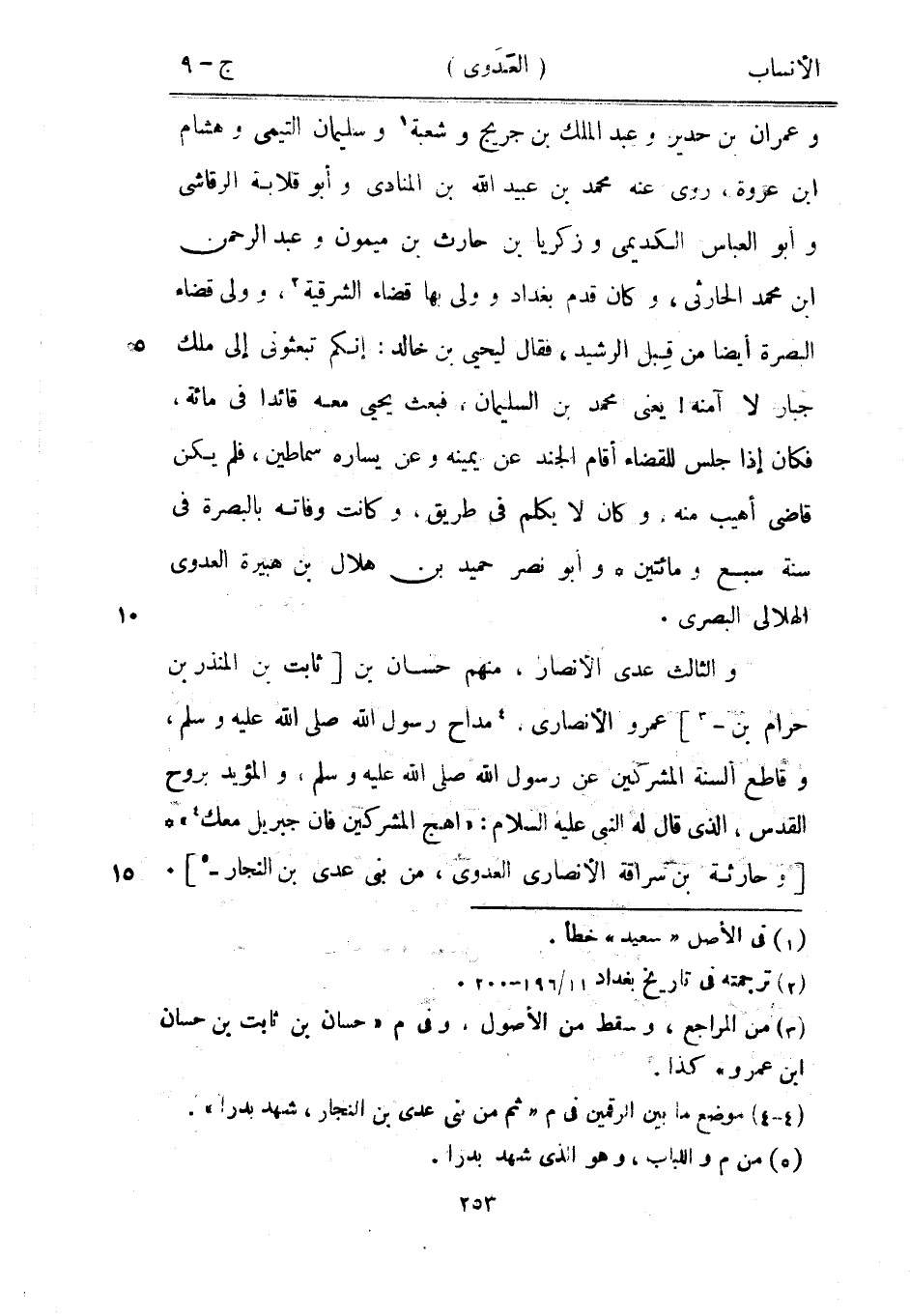 والثالث عدي الأنصار، منهم حسان بن [ثابت بن المنذر بن حرام بن-[3]] عمرو الأنصاري، [4] مداح رسول الله صلى الله عليه وسلم، وقاطع ألسنة المشركين عن رسول الله صلى الله عليه وسلم، والمؤيد بروح القدس، الّذي قال له النبي عليه السلام: «اهج المشركين فان جبريل معك [4] » [وحارثة بن سراقة الأنصاري العدوي، من بنى عدي بن النجار-[5]] .