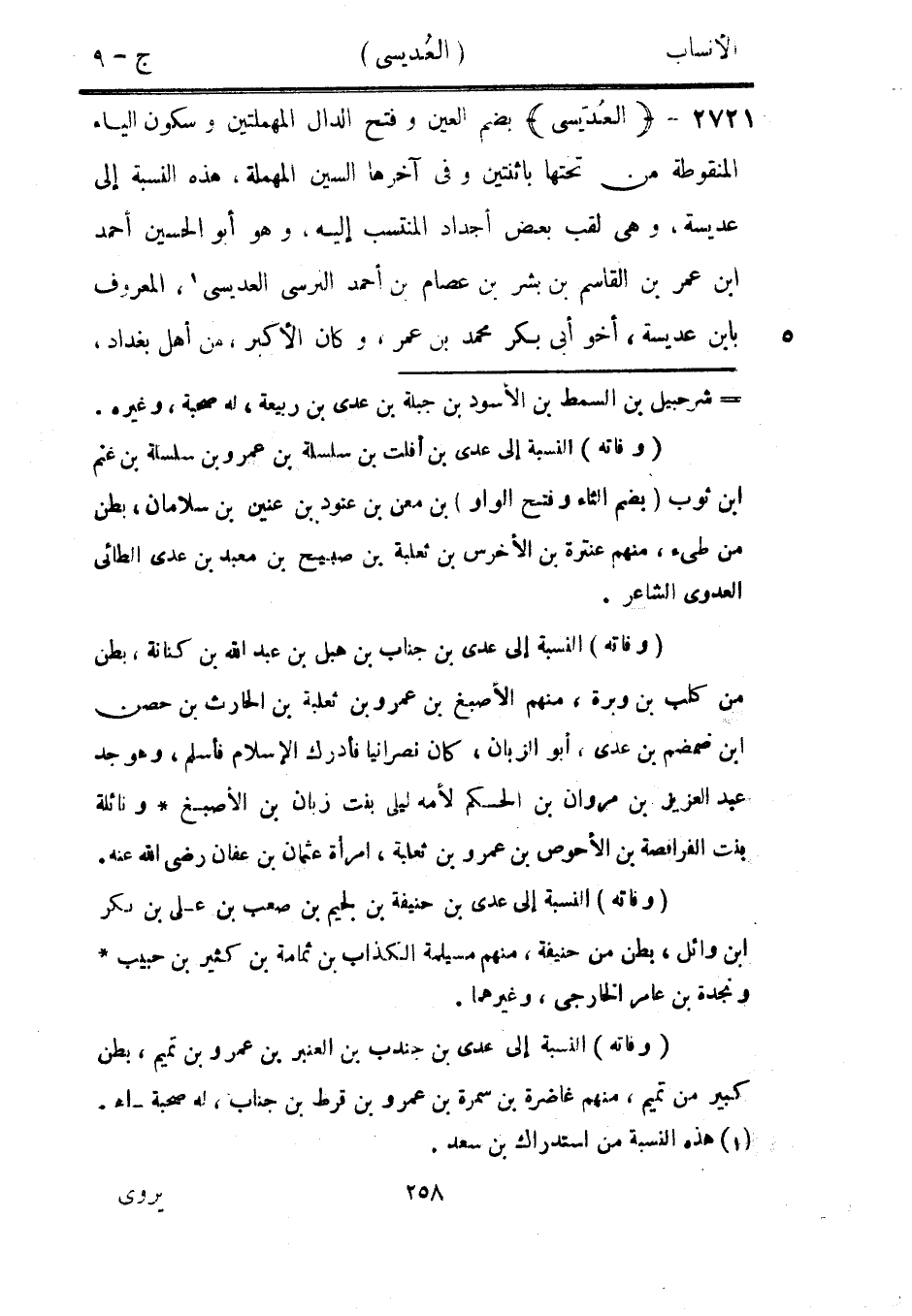 (وفاته) النسبة إلى عدي بن أفلت بن سلسلة بن عمرو بن سلسلة بن غنم ابن ثوب (بضم الثاء وفتح الواو) بن معن بن عنود بن عنين بن سلامان، بطن من طيِّئ، منهم عنترة بن الأخرس بن ثعلبة بن صبيح بن معبد بن عدي الطائي العدوي الشاعر.