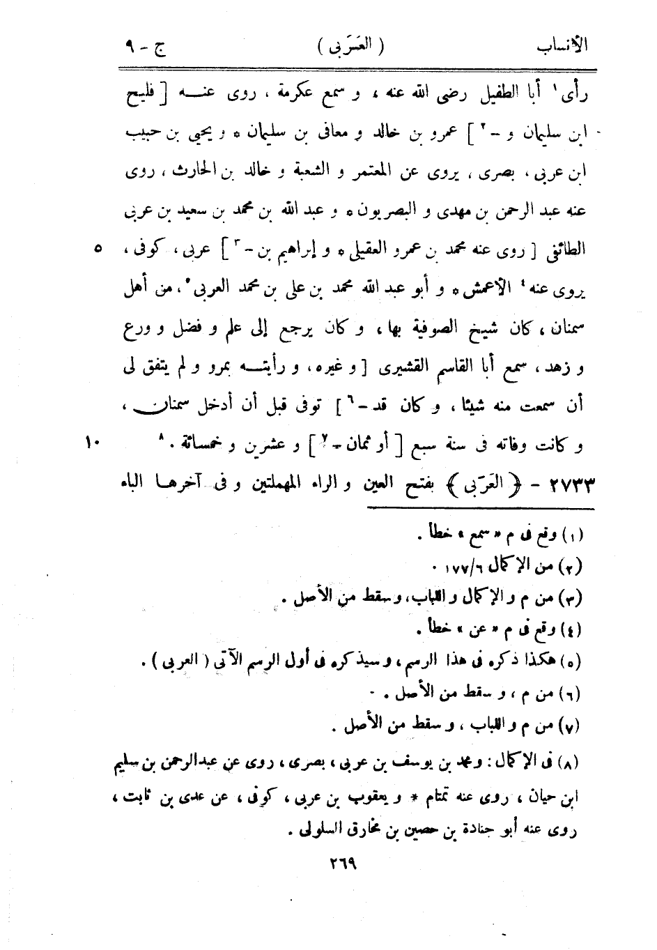 رأى [1] أبا الطفيل رضى الله عنه، وسمع عكرمة، روى عنه [فليح ابن سليمان و [2]] عمرو بن خالد ومعافى بن سليمان ويحيى بن حبيب ابن عربي، بصرى، يروى عن المعتمر والشعبة وخالد بن الحارث، روى عنه عبد الرحمن بن مهدي والبصريون وعبد الله بن محمد بن سعيد بن عربي الطائفي [روى عنه محمد بن عمرو العقيلي وإبراهيم بن-[3]] عربي، كوفى، يروى عنه [4] الأعمش وأبو عبد الله محمد بن على بن محمد العربيّ [5] ، من أهل سمنان، كان شيخ الصوفية بها، وكان يرجع إلى علم وفضل وورع وزهد، سمع أبا القاسم القشيري [وغيره، ورأيته بمرو ولم يتفق لي أن سمعت منه شيئا، وكان قد-[6]] توفى قبل أن أدخل سمنان، وكانت وفاته في سنة سبع [أو ثمان-[7]] وعشرين وخمسمائة. [8]