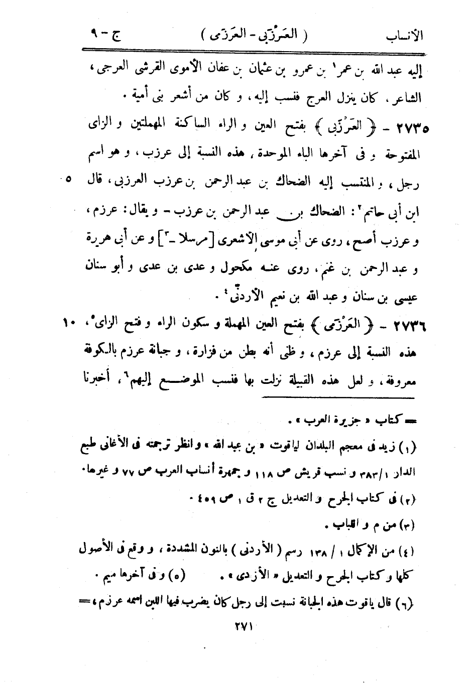 بفتح العين المهملة وسكون الراء وفتح الزاى [5] ، هذه النسبة إلى عرزم، وظني أنه بطن من فزارة، وجبانة عرزم بالكوفة معروفة، ولعل هذه القبيلة نزلت بها فنسب الموضع إليهم [6] ، أخبرنا