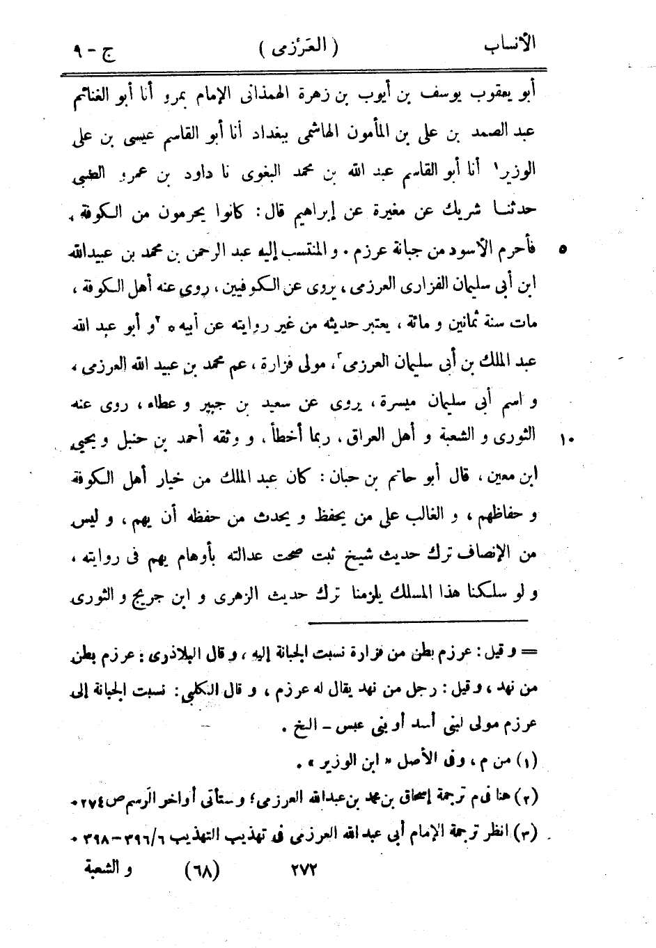 أبو يعقوب يوسف بن أيوب بن زهرة الهمذانيّ الإمام بمرو أنا أبو الغنائم عبد الصمد بن على بن المأمون الهاشمي ببغداد أنا أبو القاسم عيسى بن على الوزير [1] أنا أبو القاسم عبد الله بن محمد البغوي نا داود بن عمرو الضبيّ حدثنا شريك عن مغيرة عن إبراهيم قال: كانوا يحرمون من الكوفة، فأحرم الأسود من جبانة عرزم. والمنتسب إليه عبد الرحمن بن محمد بن عبيد الله ابن أبى سليمان الفزاري العرزميّ، يروى عن الكوفيين، روى عنه أهل الكوفة، مات سنة ثمانين ومائة، يعتبر حديثه من غير روايته عن أبيه [2] وأبو عبد الله عبد الملك بن أبى سليمان العرزميّ [3] ، مولى فزارة، عم محمد بن عبيد الله العرزميّ، واسم أبى سليمان ميسرة، يروى عن سعيد بن جبير وعطاء، روى عنه الثوري والشعبة وأهل العراق، ربما أخطأ، ووثقه أحمد بن حنبل ويحيى ابن معين، قال أبو حاتم بن حبان: كان عبد الملك من خيار أهل الكوفة وحفاظهم، والغالب على من يحفظ ويحدث من حفظه أن يهم، وليس من الإنصاف ترك حديث شيخ ثبت صحت عدالته بأوهام يهم في روايته، ولو سلكنا هذا المسلك يلزمنا ترك حديث الزهري وابن جريج والثوري