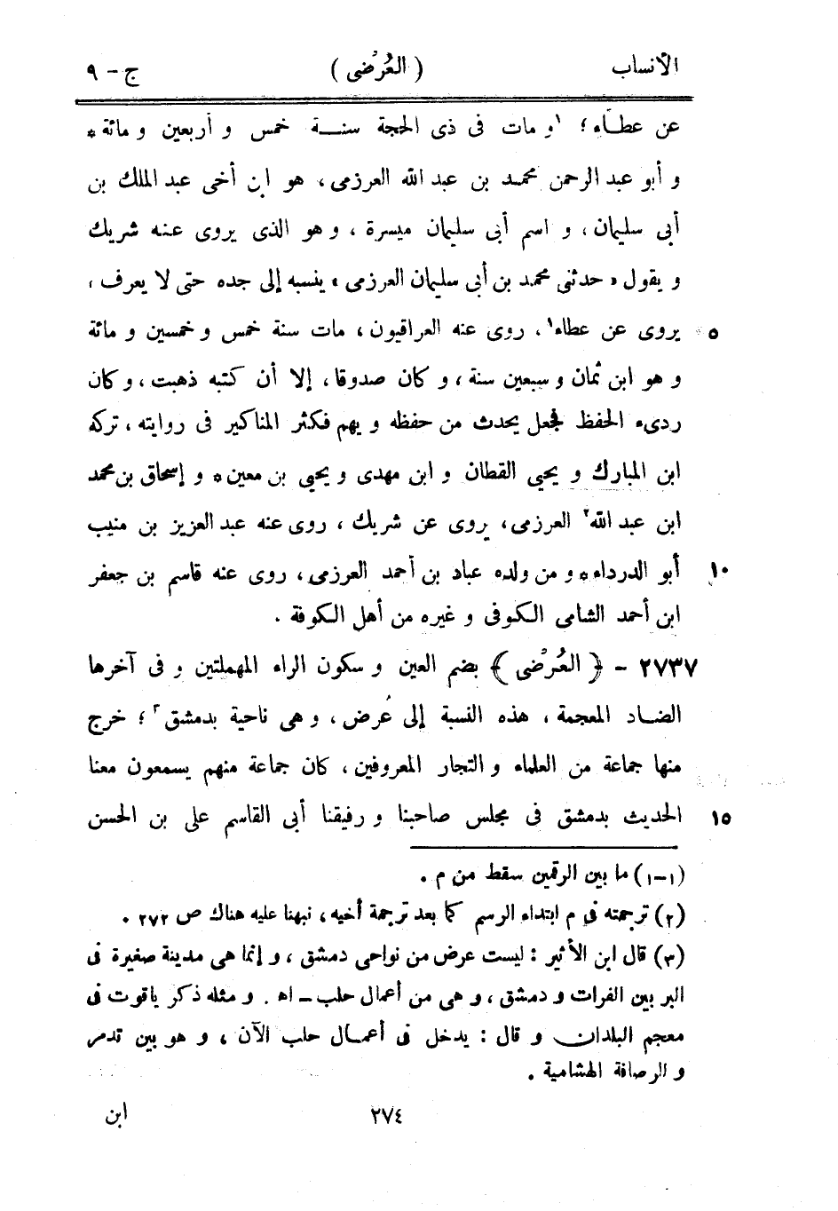 بضم العين وسكون الراء المهملتين وفي آخرها الضاد المعجمة، هذه النسبة إلى عرض، وهي ناحية بدمشق [3] ، خرج منها جماعة من العلماء والتجار المعروفين، كان جماعة منهم يسمعون معنا الحديث بدمشق في مجلس صاحبنا ورفيقنا أبى القاسم على بن الحسن