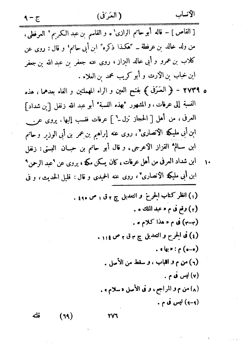 بفتح العين والراء المهملتين والفاء بعدهما، هذه النسبة إلى عرفات، والمشهور [5] بهذه النسبة [5] أبو عبد الله زنفل [بن شداد] العرفي، من أهل [الحجاز نزل-[6]] عرفات فنسب إليها، يروى عن ابن أبى مليكة الأنصاري [7] ، روى عنه إبراهيم بن عمر بن أبى الوزير وحاتم ابن سالم [8] القزاز الأعرجي، وقال أبو حاتم بن حبان البستي: زنفل ابن شداد العرفي من أهل عرفات، كان يسكن مكة، يروى عن [9] عبد الرحمن [9] ابن أبى مليكة الأنصاري [7] ، روى عنه الحميدي وقال: قليل الحديث، وفي