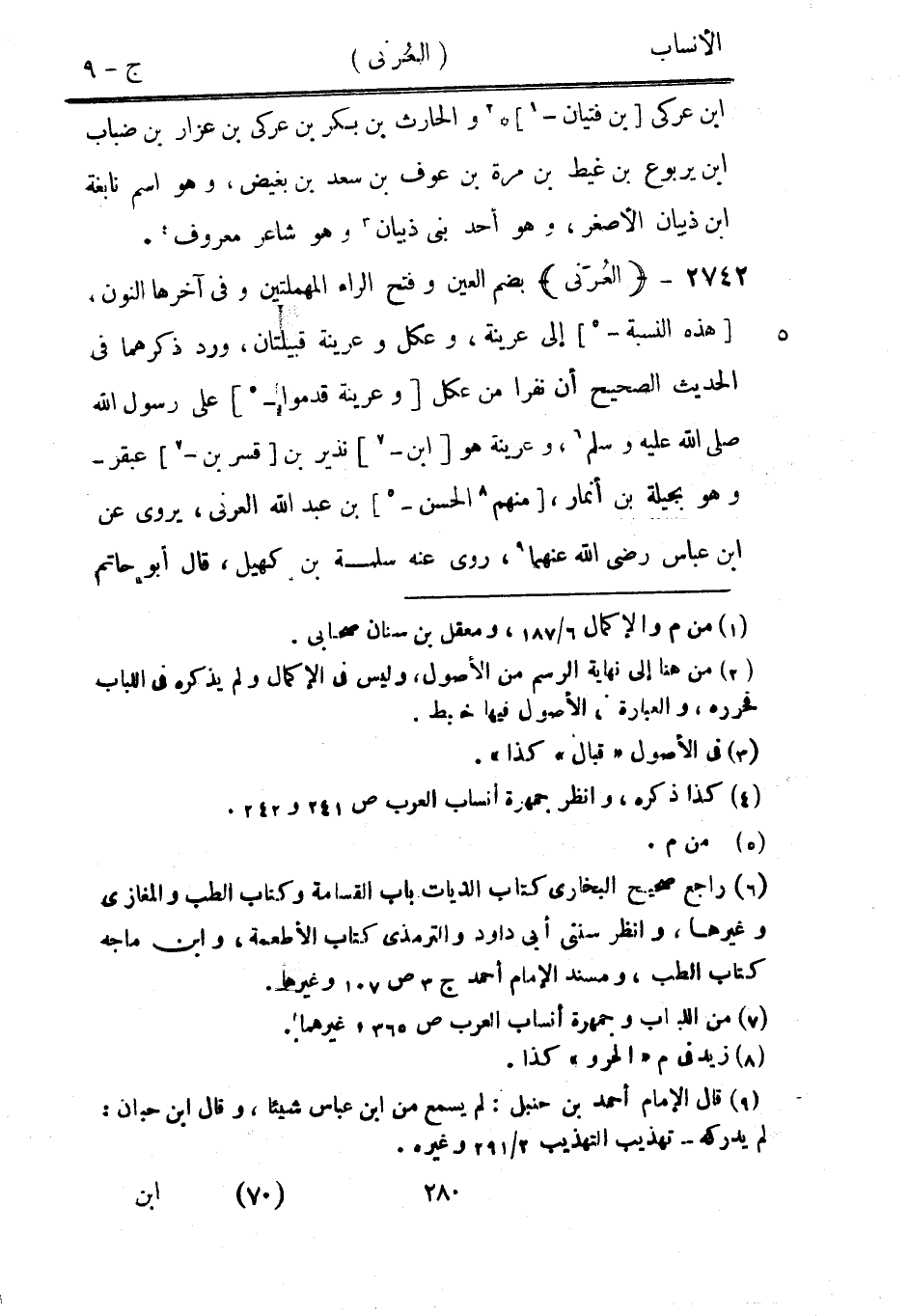 بضم العين وفتح الراء المهملتين وفي آخرها النون، [هذه النسبة-[5]] إلى عرينة، وعكل وعرينة قبيلتان، ورد ذكرهما في الحديث الصحيح أن نفرا من عكل [وعرينة قدموا-[5]] على رسول الله صلى الله عليه وسلم [6] ، وعرينة هو [ابن-[7]] نذير بن [قسر بن-[7]] عبقر- وهو بجيلة بن أنمار، [منهم [8] الحسن-[5]] بن عبد الله العرني، يروى عن ابن عباس رضى الله عنهما [9] ، روى عنه سلمة بن كهيل، قال أبو حاتم