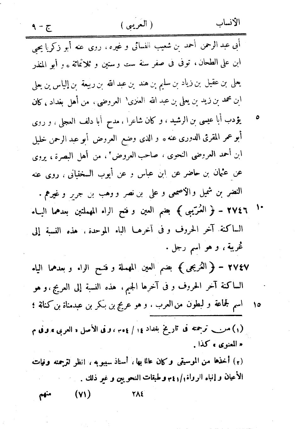أبى عبد الرحمن أحمد بن شعيب النسائي وغيره، روى عنه أبو زكريا يحيى ابن على الطحان، توفى في صفر سنة ست وستين وثلاثمائة وأبو المنذر يعلى بن عقيل بن زياد بن سليم بن هند بن عبد الله بن ربيعة بن إلياس بن يعلى ابن محمد بن زيد بن يعلى بن عبد الله العنزي [1] العروضي، من أهل بغداد، كان يؤدب أبا عيسى بن الرشيد، وكان شاعرا، مدح أبا دلف العجليّ، وروى أبو عمر المقرئ الدوري عنه والّذي وضع العروض أبو عبد الرحمن خليل ابن أحمد العروضي النحويّ، صاحب العروض [2] ، من أهل البصرة، يروى عن عثمان بن حاضر عن ابن عباس وعن أيوب السختياني، روى عنه النضر بن شميل والأصمعي وعلى بن نصر ووهب بن جرير وغيرهم.