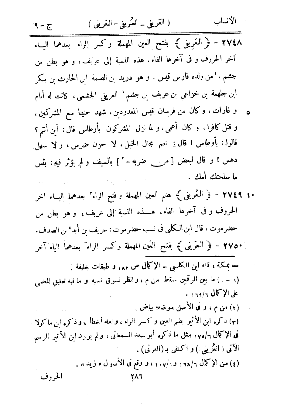 [3] ذكره ابن الأثير بضم العين وكسر الراء، ولعله أخطأ، وذكره ابن ماكولا في الإكمال 6/ 175 مثل ما ذكره أبو سعد السمعاني، ولم يورد ابن الأثير الرسم الآتي (العرينى) واكتفى ب (العرني) .