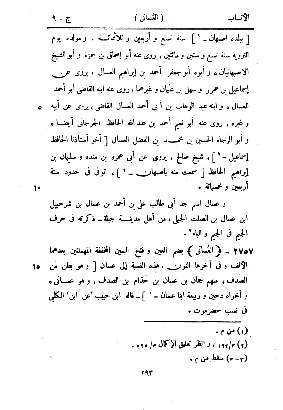 بضم العين وفتح السين المخففة المهملتين بعدهما الألف وفي آخرها النون، هذه النسبة إلى عسان [وهو بطن من الصدف، منهم جمان بن عسان بن حذام بن الصدف، وهو عسانى وأخواه دحين وربيعة ابنا عسان-[1]]- قاله ابن حبيب [3] عن ابن [3] الكلبي في نسب حضرموت.