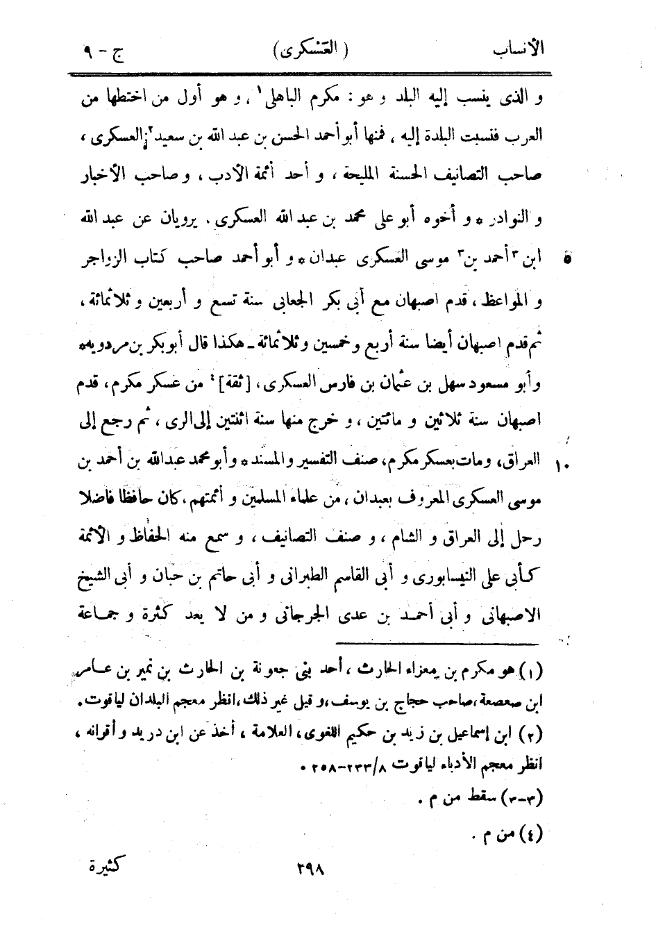 والّذي ينسب إليه البلد وهو: مكرم الباهلي [1] ، وهو أول من اختطها من العرب فنسبت البلدة إليه، فمنها أبو أحمد الحسن بن عبد الله بن سعيد [2] العسكري، صاحب التصانيف الحسنة المليحة، وأحد أئمة الأدب، وصاحب الأخبار والنوادر وأخوه أبو على محمد بن عبد الله العسكري، يرويان عن عبد الله ابن [3] أحمد بن [3] موسى العسكري عبدان وأبو أحمد صاحب كتاب الزواجر والمواعظ، قدم أصبهان مع أبى بكر الجعابيّ سنة تسع وأربعين وثلاثمائة، ثم قدم أصبهان أيضا سنة أربع وخمسين وثلاثمائة- هكذا قال أبو بكر بن مردويه وأبو مسعود سهل بن عثمان بن فارس العسكري، [ثقة] [4] من عسكر مكرم، قدم أصبهان سنة ثلاثين ومائتين، وخرج منها سنة اثنتين إلى الري، ثم رجع إلى العراق، ومات بعسكر مكرم، صنف التفسير والمسند وأبو محمد عبد الله بن أحمد بن موسى العسكري المعروف بعبدان، من علماء المسلمين وأئمتهم، كان حافظا فاضلا رحل إلى العراق والشام، وصنف التصانيف، وسمع منه الحفاظ والأئمة كأبى على النيسابورىّ وأبى القاسم الطبراني وأبى حاتم بن حبان وأبى الشيخ الأصبهاني وأبى أحمد بن عدي الجرجاني ومن لا يعد كثرة وجماعة