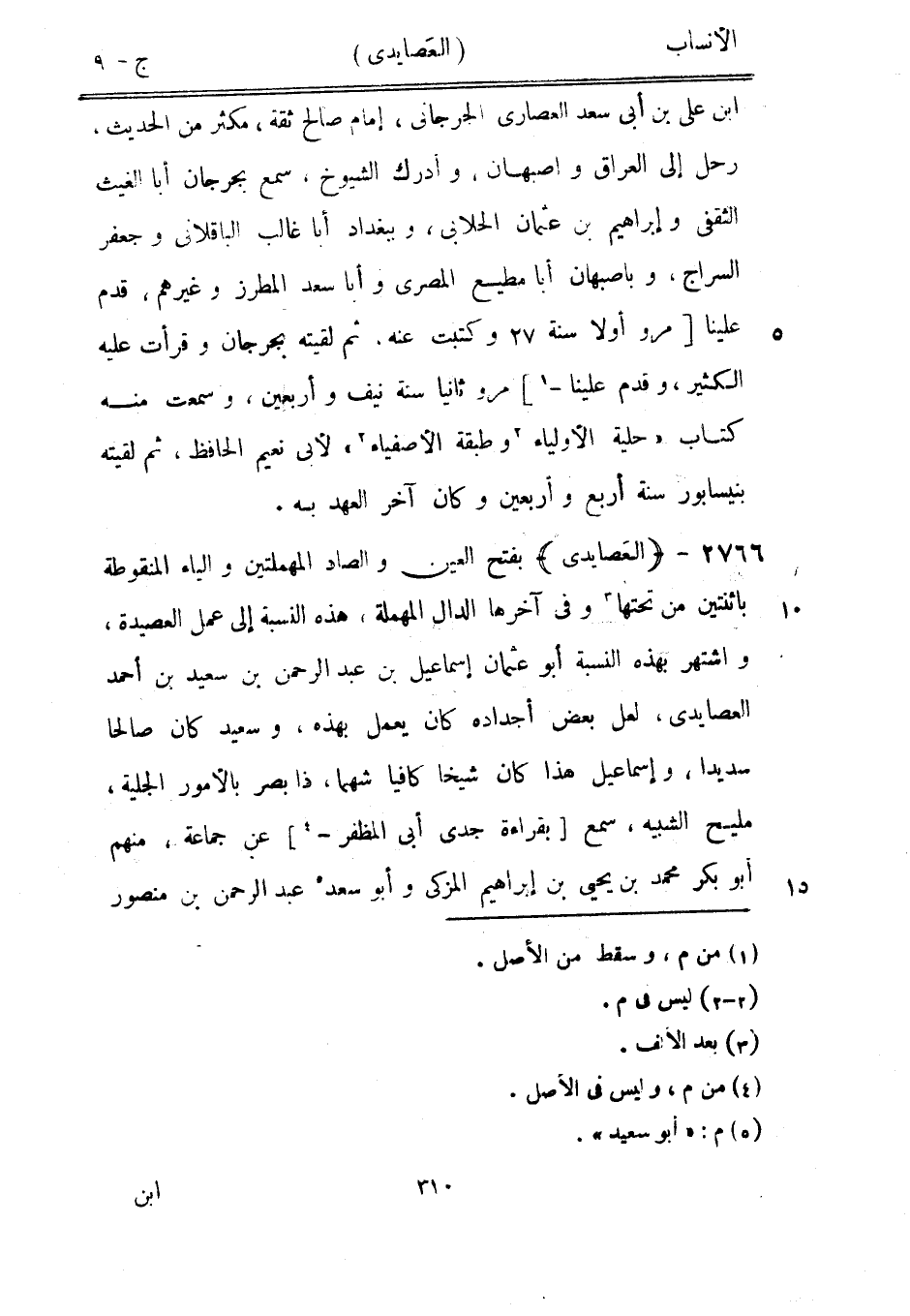 بفتح العين والصاد المهملتين والياء المنقوطة باثنتين من تحتها [3] وفي آخرها الدال المهملة، هذه النسبة إلى عمل العصيدة، واشتهر بهذه النسبة أبو عثمان إسماعيل بن عبد الرحمن بن سعيد بن أحمد العصايدى، لعل بعض أجداده كان يعمل بهذه، وسعيد كان صالحا سديدا، وإسماعيل هذا كان شيخا كافيا شهما، ذا بصر بالأمور الجلية، مليح الشبيه، سمع [بقراءة جدي أبى المظفر-[4]] عن جماعة، منهم 5 بو بكر محمد بن يحيى بن إبراهيم المزكي وأبو سعد [5] عبد الرحمن بن منصور