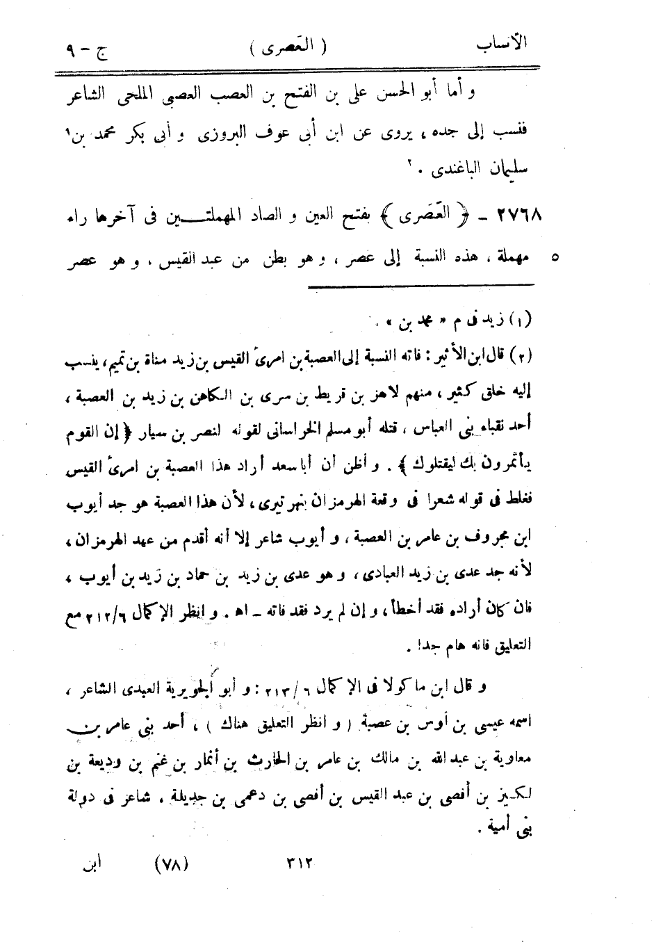[2] قال ابن الأثير: فاته النسبة إلى العصبة بن امرئ القيس بن زيد مناة بن تميم، ينسب إليه خلق كثير، منهم لاهز بن قريط بن سرى بن الكاهن بن زيد بن العصبة، أحد نقباء بنى العباس، قتله أبو مسلم الخراساني لقوله لنصر بن سيار (إن القوم يَأْتَمِرُونَ بِكَ لِيَقْتُلُوكَ 28: 20) . وأظن أن أبا سعد أراد هذا العصبةبن امرئ القيس فغلط في قوله شعرا في وقعة الهرمزان بنهر تيري، لأن هذا العصبة هو جد أيوب ابن مجروف بن عامر بن العصبة، وأيوب شاعر إلا أنه أقدم من عهد الهرمزان، لأنه جد عدي بن زيد العبادي، وهو عدي بن زيد بن حماد بن زيد بن أيوب، فان كان أراده فقد أخطأ، وإن لم يرد فقد فاته- انتهى. وانظر الإكمال 6/ 212 مع التعليق فإنه هام جدا.