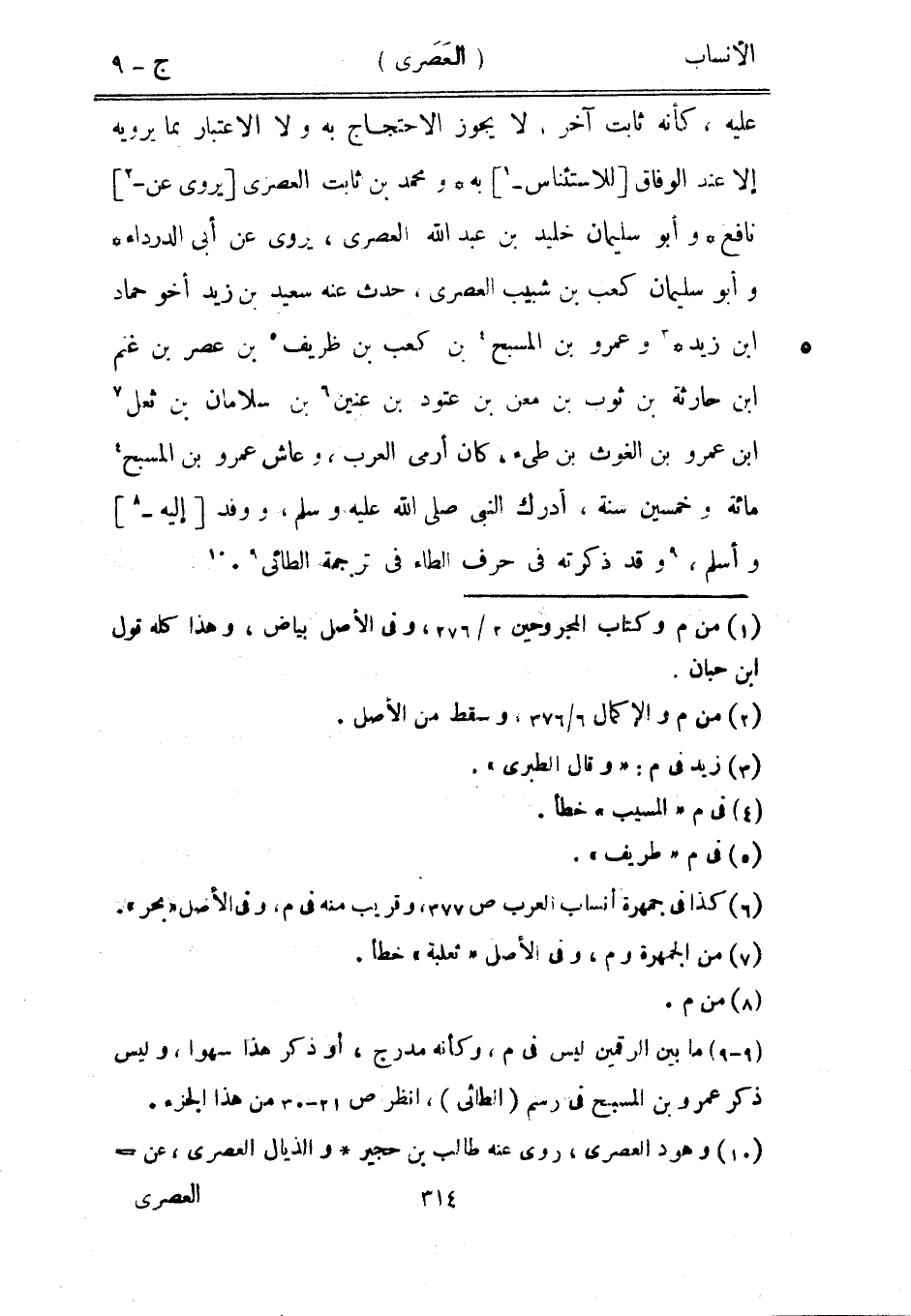 عليه، كأنه ثابت آخر، لا يجوز الاحتجاج به ولا الاعتبار بما يرويه إلا عند الوفاق [للاستئناس-[1]] به ومحمد بن ثابت العصرى [يروى عن-[2]] نافع وأبو سليمان خليد بن عبد الله العصرى، يروى عن أبى الدرداء وأبو سليمان كعب بن شبيب العصرى، حدث عنه سعيد بن زيد أخو حماد ابن زيد [3] وعمرو بن المسبح [4] بن كعب بن ظريف [5] بن عصر بن غنم ابن حارثة بن ثوب بن معن بن عتود بن عنين [6] بن سلامان بن ثعل [7] ابن عمرو بن الغوث بن طيِّئ، كان أرمى العرب، وعاش عمرو بن المسبح [4] مائة وخمسين سنة، أدرك النبي صلى الله عليه وسلم، ووفد [إليه-[8]] وأسلم، [9] وقد ذكرته في حرف الطاء في ترجمة الطائي [9] . [10]