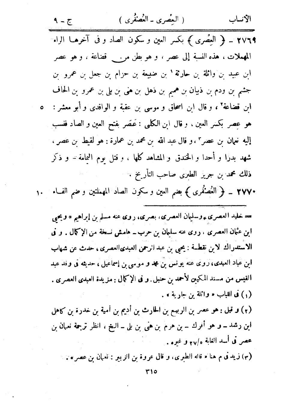 [ () ] خليد العصرى وسليمان العصرى، بصرى، روى عنه مسلم بن إبراهيم ويحيى ابن عثمان العصرى، روى عنه سليمان بن حرب- هامش نسخة من الإكمال. وفي الاستدراك لابن نقطة: يحيى بن عبد الرحمن العبديّ العصرى، حدث عن شهاب ابن عباد العبديّ، روى عنه يونس بن محمد وموسى بن إسماعيل، حديثه في وفد عبد القيس من مسند المكيين لأحمد بن حنبل. وفي الإكمال: مزيدة العبديّ العصرى.