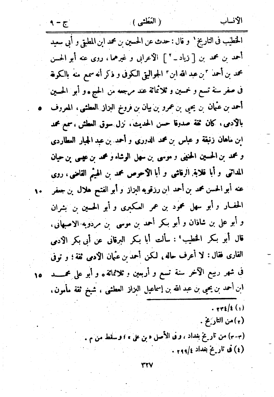 الخطيب في التاريخ [1] وقال: حدث عن الحسين بن محمد ابن المطبقي وأبى سعيد أحمد بن محمد بن [زياد-[2]] الأعرابي وغيرهما، روى عنه أبو الحسن محمد بن أحمد [3] بن عبد الله ابن [3] الجواليقيّ الكوفي وذكر أنه سمع منه بالكوفة في صفر سنة تسع وخمسين وثلاثمائة عند مرجعه من الحج وأبو الحسين أحمد بن عثمان بن يحيى بن عمرو بن بيان بن فروخ البزاز العطشى، المعروف بالأدمي، كان ثقة صدوقا حسن الحديث، نزل سوق العطش، سمع محمد ابن ماهان زنبقة وعباس بن محمد الدوري وأحمد بن عبد الجبار العطاردي ومحمد بن الحسين الحنينى وموسى بن سهل الوشاء ومحمد بن عيسى بن حيان المدائني وأبا قلابة الرقاشيّ وأبا الأحوص محمد بن الهيثم القاضي، روى عنه أبو الحسن محمد بن أحمد ابن رزقويه البزاز وأبو الفتح هلال بن جعفر الحفار وأبو سهل محمود بن عمر العكبريّ وأبو الحسين بن بشران وأبو على بن شاذان وأبو بكر أحمد بن موسى بن مردويه الأصبهاني، قال أبو بكر الخطيب [4] : سألت أبا بكر البرقاني عن أبى بكر الأدمي القاري فقال: لا أعرف حاله، لكن أحمد بن عثمان الأدمي ثقة، وتوفى في شهر ربيع الآخر سنة تسع وأربعين وثلاثمائة وأبو على محمد ابن أحمد بن يحيى بن عبد الله بن إسماعيل البزاز العطشى، شيخ ثقة مأمون،