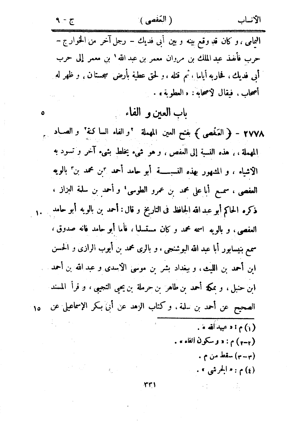 بفتح العين المهملة [2] والفاء الساكنة [2] والصاد المهملة، هذه النسبة إلى العفص، وهو شيء يخلط بشيء آخر وتسود به الأشياء، والمشهور بهذه النسبة أبو حامد أحمد [3] بن محمد بن [3] بالويه العفصى، سمع أبا على محمد بن عمرو الطوسي [4] وأحمد بن سلمة البزاز، ذكره الحاكم أبو عبد الله الحافظ في التاريخ وقال: أحمد بن بالويه أبو حامد العفصى، وبالويه اسمه محمد وكان مستسلما، فأما أبو حامد فإنه صدوق، سمع بنيسابور أبا عبد الله البوشنجي، وبالري محمد بن أيوب الرازيّ والحسن ابن أحمد بن الليث، وببغداد بشر بن موسى الأسدي وعبد الله بن أحمد ابن حنبل، وبمكة أحمد بن طاهر بن حرملة بن يحيى التجيبي، وقرأ المسند الصحيح عن أحمد بن سلمة، وكتاب الزهد عن أبى بكر الإسماعيلي عن