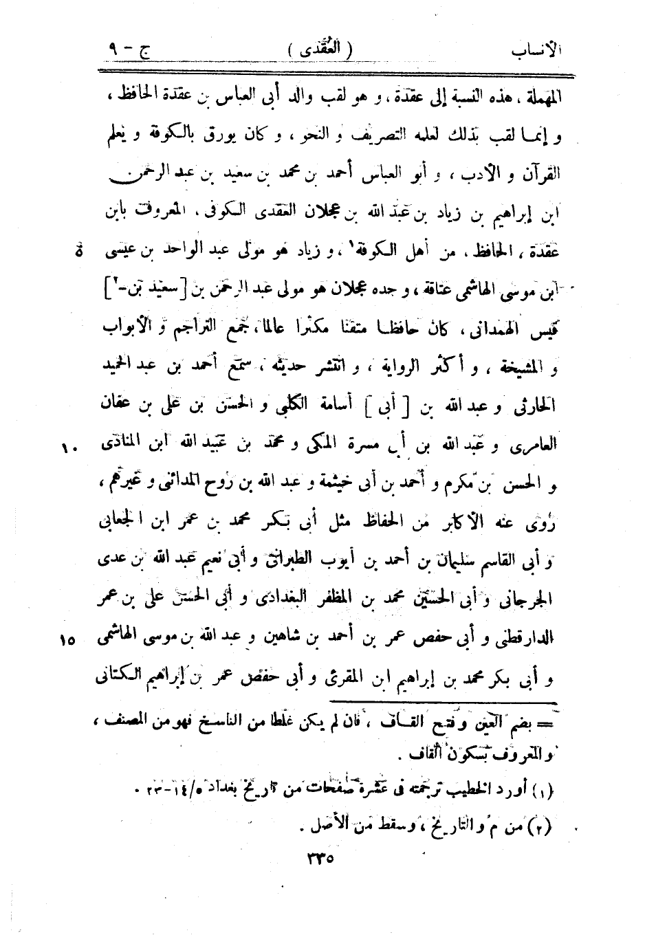 المهملة، هذه النسبة إلى عقدة، وهو لقب والد أبى العباس بن عقدة الحافظ، وإنما لقب بذلك لعلمه التصريف والنحو، وكان يورق بالكوفة ويعلم القرآن والأدب، وأبو العباس أحمد بن محمد بن سعيد بن عبد الرحمن ابن إبراهيم بن زياد بن عبد الله بن عجلان العقدي الكوفي، المعروف بابن عقدة، الحافظ، من أهل الكوفة [1] ، وزياد هو مولى عبد الواحد بن عيسى ابن موسى الهاشمي عتاقة، وجده عجلان هو مولى عبد الرحمن بن [سعيد بن-[2]] قيس الهمدانيّ، كان حافظا متقنا مكثرا عالما، جمع التراجم والأبواب والمشيخة، وأكثر الرواية، وانتشر حديثه، سمع أحمد بن عبد الحميد الحارثي وعبد الله بن [أبى] أسامة الكلبي والحسن بن على بن عفان العامري وعبد الله بن أبى مسرة المكيّ ومحمد بن عبيد الله ابن المنادي والحسن بن مكرم وأحمد بن أبى خيثمة وعبد الله بن روح المدائني وغيرهم، روى عنه الأكابر من الحفاظ مثل أبى بكر محمد بن عمر ابن الجعابيّ وأبى القاسم سليمان بن أحمد بن أيوب الطبراني وأبى نعيم عبد الله بن عدي الجرجاني وأبى الحسين محمد بن المظفر البغدادي وأبى الحسن على بن عمر الدار قطنى وأبى حفص عمر بن أحمد بن شاهين وعبد الله بن موسى الهاشمي وأبى بكر محمد بن إبراهيم ابن المقرئ وأبى حفص عمر بن إبراهيم الكتاني