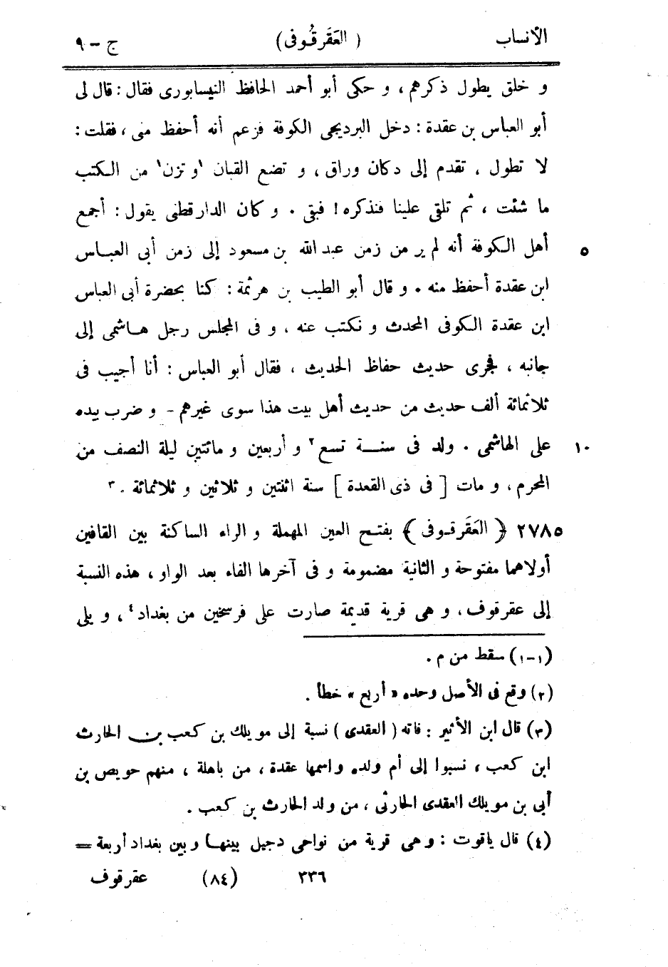 بفتح العين المهملة والراء الساكنة بين القافين أولاهما مفتوحة والثانية مضمومة وفي آخرها الفاء بعد الواو، هذه النسبة إلى عقرقوف، وهي قرية قديمة صارت على فرسخين من بغداد [4] ، ويلي