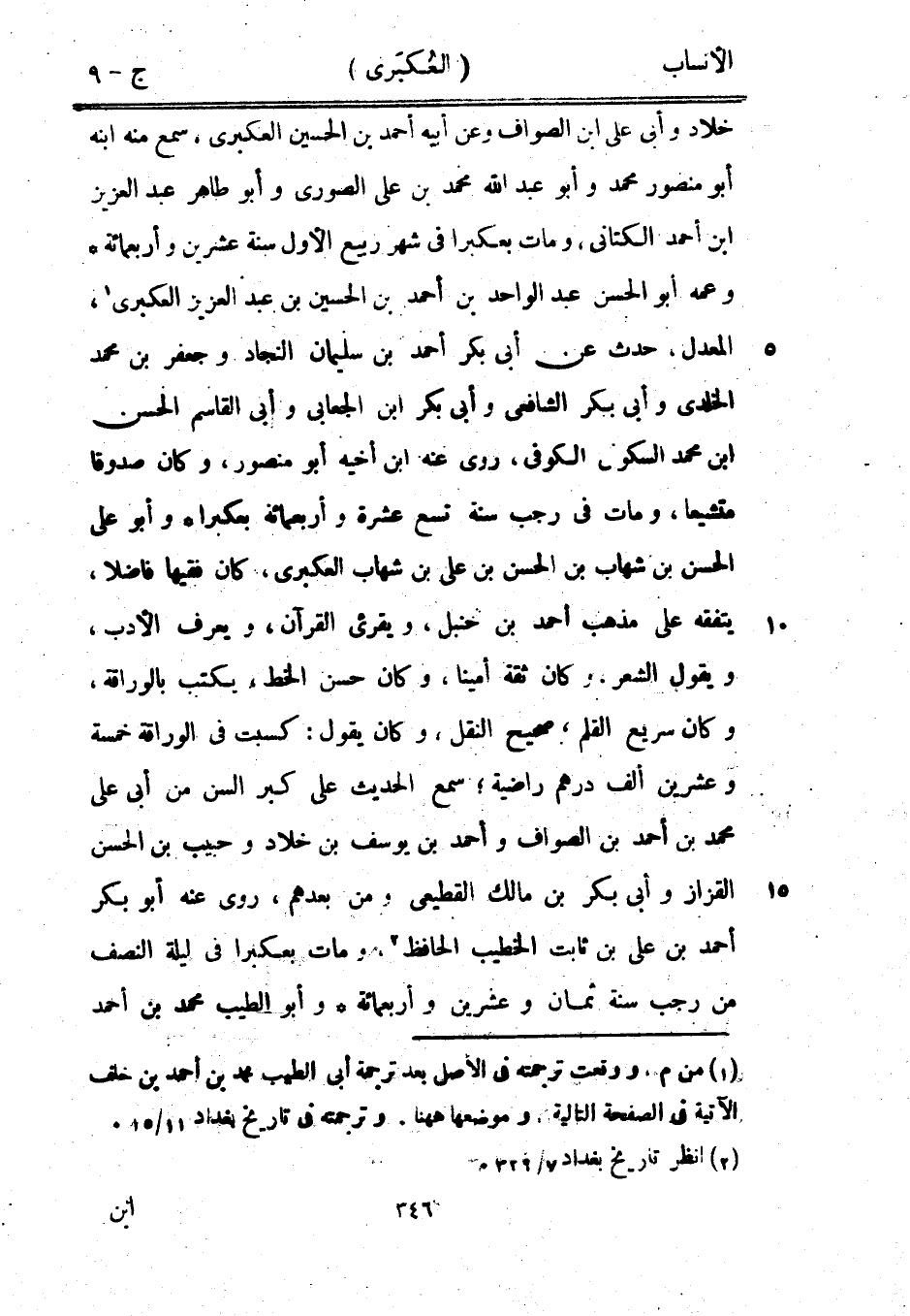 خلاد وأبى على ابن الصواف وعن أبيه أحمد بن الحسين العكبريّ، سمع منه ابنه أبو منصور محمد وأبو عبد الله محمد بن على الصوري وأبو طاهر عبد العزيز ابن أحمد الكتاني، ومات بعكبرا في شهر ربيع الأول سنة عشرين وأربعمائة وعمه أبو الحسن عبد الواحد بن أحمد بن الحسين بن عبد العزيز العكبريّ [1] ، المعدل، حدث عن أبى بكر أحمد بن سليمان النجاد وجعفر بن محمد الخلدى وأبى بكر الشافعيّ وأبى بكر ابن الجعابيّ وأبى القاسم الحسن ابن محمد السكونيّ الكوفي، روى عنه ابن أخيه أبو منصور، وكان صدوقا متشيعا، ومات في رجب سنة تسع عشرة وأربعمائة بعكبرا وأبو على الحسن بن شهاب بن الحسن بن على بن شهاب العكبريّ، كان فقيها فاضلا، يتفقه على مذهب أحمد بن حنبل، ويقرئ القرآن، ويعرف الأدب، ويقول الشعر، وكان ثقة أمينا، وكان حسن الخط، يكتب بالوراقة، وكان سريع القلم، صحيح النقل، وكان يقول: كسبت في الوراقة خمسة وعشرين ألف درهم راضية، سمع الحديث على كبر السن من أبى على محمد بن أحمد بن الصواف وأحمد بن يوسف بن خلاد وحبيب بن الحسن القزاز وأبى بكر بن مالك القطيعي ومن بعدهم، روى عنه أبو بكر أحمد بن على بن ثابت الخطيب الحافظ [2] ، ومات بعكبرا في ليلة النصف من رجب سنة ثمان وعشرين وأربعمائة وأبو الطيب محمد بن أحمد