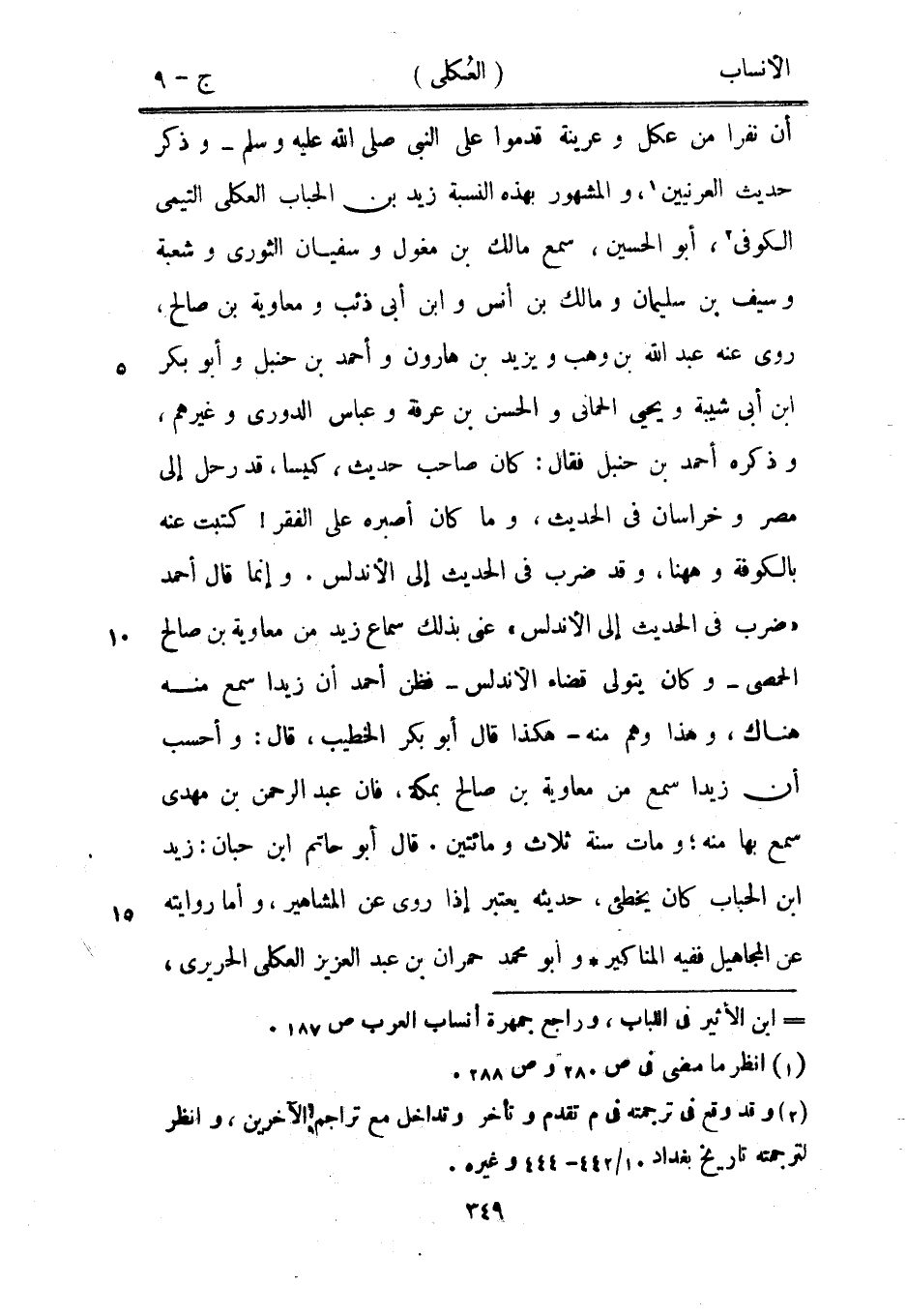أن نفرا من عكل وعرينة قدموا على النبي صلى الله عليه وسلم- وذكر حديث العرنيين [1] ، والمشهور بهذه النسبة زيد بن الحباب العكلي التيمي الكوفي [2] ، أبو الحسين، سمع مالك بن مغول وسفيان الثوري وشعبة وسيف بن سليمان ومالك بن أنس وابن أبى ذئب ومعاوية بن صالح، روى عنه عبد الله بن وهب ويزيد بن هارون وأحمد بن حنبل وأبو بكر ابن أبى شيبة ويحيى الحماني والحسن بن عرفة وعباس الدوري وغيرهم، وذكره أحمد بن حنبل فقال: كان صاحب حديث، كيسا، قد رحل إلى مصر وخراسان في الحديث، وما كان أصبره على الفقر! كتبت عنه بالكوفة وهاهنا، وقد ضرب في الحديث إلى الأندلس. وإنما قال أحمد «ضرب في الحديث إلى الأندلس» عنى بذلك سماع زيد من معاوية بن صالح الحمصي- وكان يتولى قضاء الأندلس- فظن أحمد أن زيدا سمع منه هناك، وهذا وهم منه- هكذا قال أبو بكر الخطيب، قال: وأحسب أن زيدا سمع من معاوية بن صالح بمكة، فان عبد الرحمن بن مهدي سمع بها منه، ومات سنة ثلاث ومائتين. قال أبو حاتم ابن حبان: زيد ابن الحباب كان يخطئ، حديثه يعتبر إذا روى عن المشاهير، وأما روايته عن المجاهيل ففيه المناكير وأبو محمد حمران بن عبد العزيز العكلي الحريري،