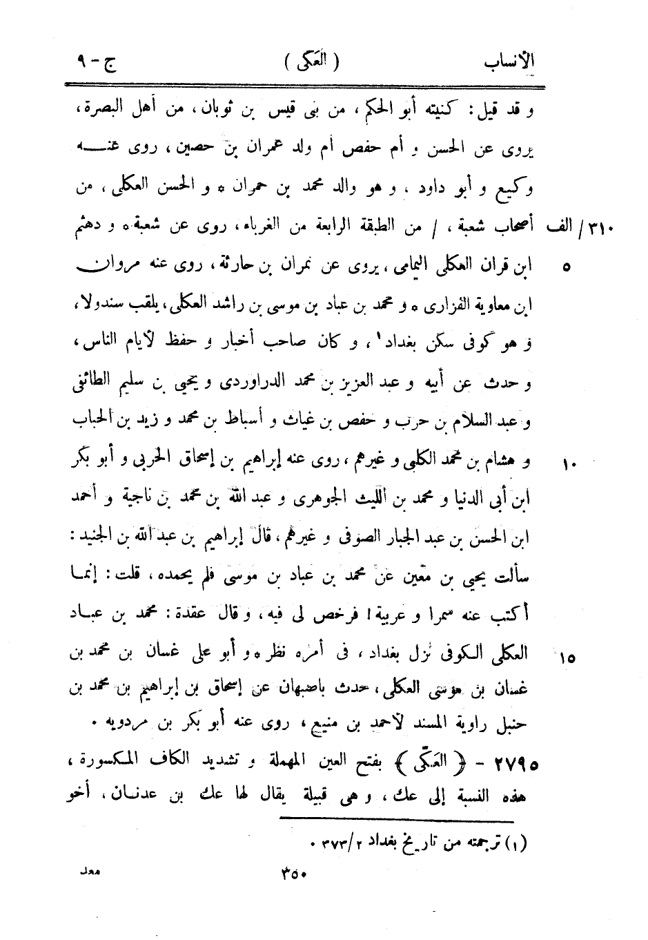 وقد قيل: كنيته أبو الحكم، من بنى قيس بن ثوبان، من أهل البصرة، يروى عن الحسن وأم حفص أم ولد عمران بن حصين، روى عنه وكيع وأبو داود، وهو والد محمد بن حمران والحسن العكلي، من 310/ ألف أصحاب شعبة،/ من الطبقة الرابعة من الغرباء، روى عن شعبة ودهثم ابن قران العكلي اليمامي، يروى عن نمران بن حارثة، روى عنه مروان ابن معاوية الفزاري ومحمد بن عباد بن موسى بن راشد العكلي، يلقب سندولا، وهو كوفى سكن بغداد [1] ، وكان صاحب أخبار وحفظ لأيام الناس، وحدث عن أبيه وعبد العزيز بن محمد الدراوَرْديّ ويحيى بن سليم الطائفي وعبد السلام بن حرب وحفص بن غياث وأسباط بن محمد وزيد بن الحباب وهشام بن محمد الكلبي وغيرهم، روى عنه إبراهيم بن إسحاق الحربي وأبو بكر ابن أبى الدنيا ومحمد بن الليث الجوهري وعبد الله بن محمد بن ناجية وأحمد ابن الحسن بن عبد الجبار الصوفي وغيرهم، قال إبراهيم بن عبد الله بن الجنيد: