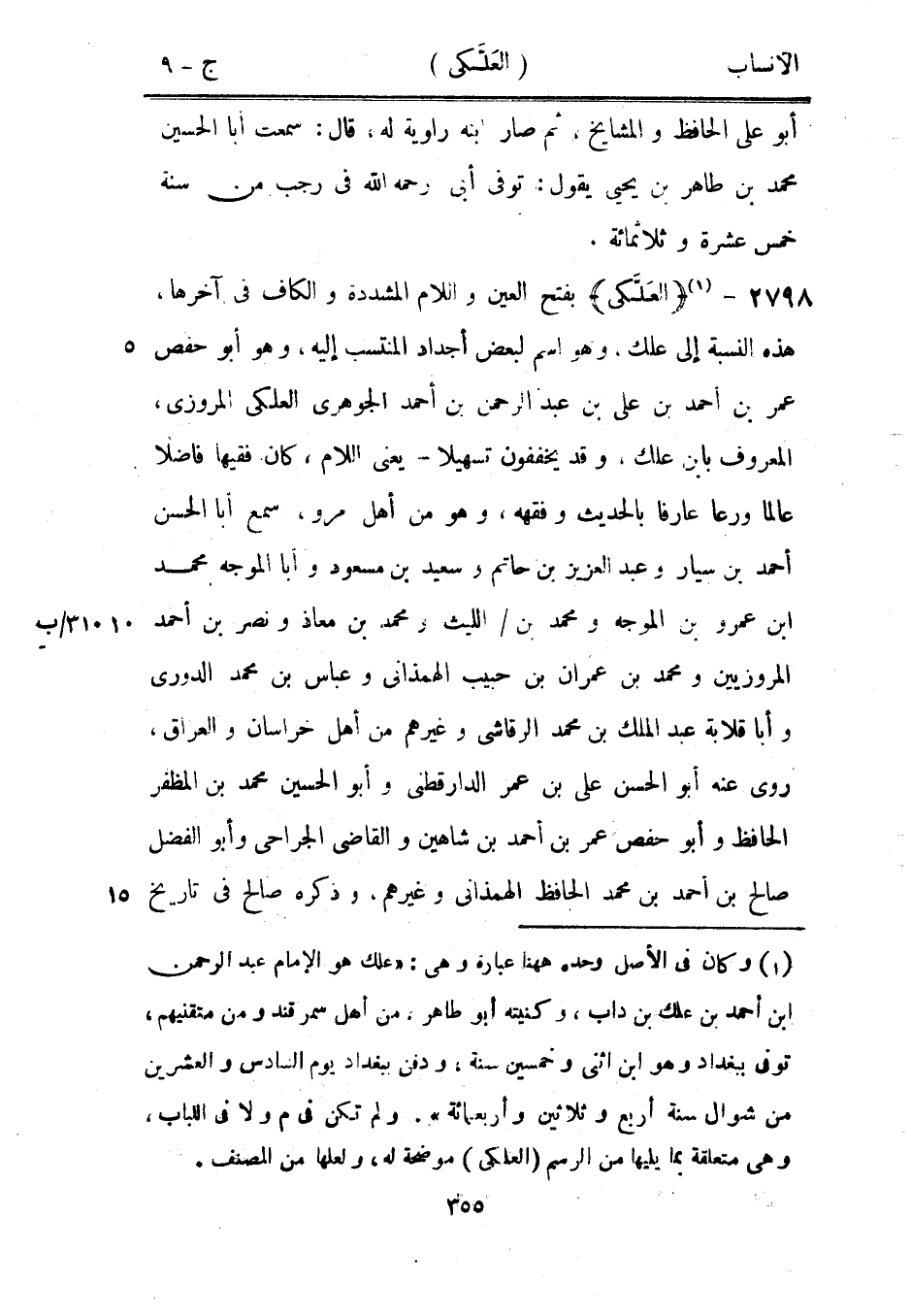 [1] وكان في الأصل وحده هاهنا عبارة وهي: «علك هو الإمام عبد الرحمن ابن أحمد بن علك بن داب، وكنيته أبو طاهر. من أهل سمرقند ومن متقنيهم، توفى ببغداد وهو ابن اثنى وخمسين سنة، ودفن ببغداد يوم السادس والعشرين من شوال سنة أربع وثلاثين وأربعمائة» . ولم تكن في م ولا في اللباب، وهي متعلقة بما يليها من الرسم (العلكى) موضحة له، ولعلها من المصنف.