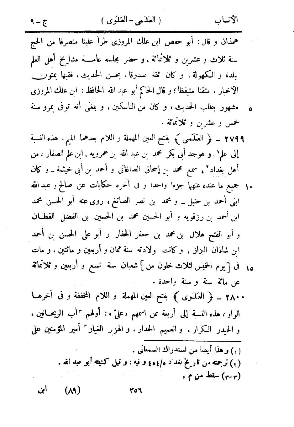بفتح العين المهملة واللام بعدهما الميم، هذه النسبة إلى علم [1] ، وهو جد أبى بكر محمد بن عبد الله بن عمرويه، ابن علم الصفار، من أهل بغداد [2] ، سمع محمد بن إسحاق الصاغاني وأحمد بن أبى خيثمة- وكان جميع ما عنده عنهما جزءا واحدا وفي آخره حكايات عن صالح وعبد الله ابني أحمد بن حنبل- ومحمد بن نصر الصائغ، روى عنه أبو الحسن محمد ابن أحمد بن رزقويه وأبو الحسين محمد بن الحسين بن الفضل القطان وأبو الفتح هلال بن محمد بن جعفر الحفار وأبو على الحسن بن أحمد ابن شاذان البزاز، وكانت ولادته سنة ثمان وأربعين ومائتين، ومات في [يوم الخميس لثلاث خلون من] شعبان سنة تسع وأربعين وثلاثمائة عن مائة سنة وسنة واحدة.