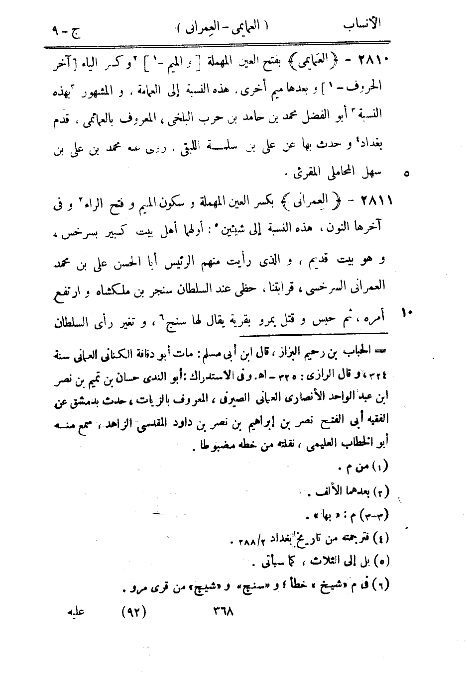 بكسر العين المهملة وسكون الميم وفتح الراء [2] وفي آخرها النون، هذه النسبة إلى شيئين [5] : أولهما أهل بيت كبير بسرخس، وهو بيت قديم، والّذي رأيت منهم الرئيس أبا الحسن على بن محمد العمراني السرخسي، قرابتنا، حظي عند السلطان سنجر بن ملك شاه وارتفع أمره، ثم حبس وقتل بمرو بقرية يقال لها سنج [6] ، وتغير رأى السلطان