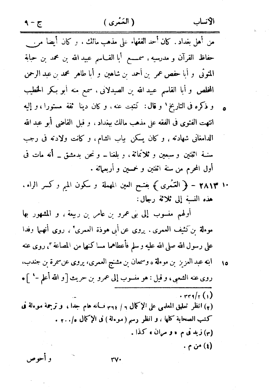 أولهم منسوب إلى بنى عمرو بن عامر بن ربيعة، والمشهور بها موءلة بن كثيف العمرى، يروى عن أبى هوذة العمرى [2] ، روى أنهما وفدا على رسول الله صلى الله عليه وسلم فأعطاهما مساكنهما من المصاعة [3] ، روى عنه ابنه عبد العزيز بن موءلة وسمعان بن مشنج العمرى، يروى عن سمرة بن جندب، روى عنه الشعبي، وقيل: هو منسوب إلى عمرو بن حريث [والله أعلم-[4]]