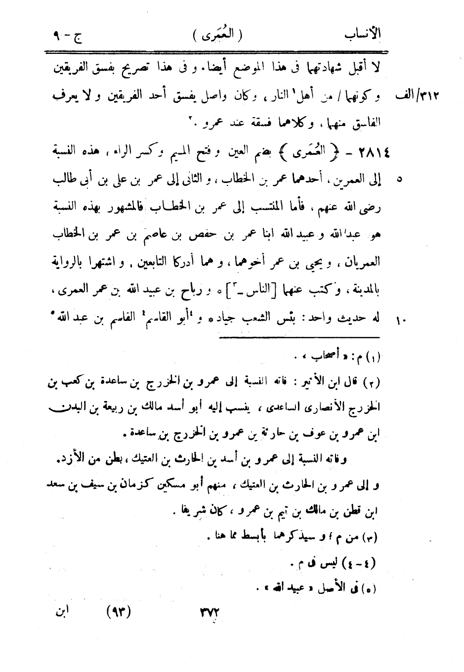 بضم العين وفتح الميم وكسر الراء، هذه النسبة إلى العمرين، أحدهما عمر بن الخطاب، والثاني إلى عمر بن على بن أبى طالب رضى الله عنهم، فأما المنتسب إلى عمر بن الخطاب فالمشهور بهذه النسبة هو عبد الله وعبيد الله ابنا عمر بن حفص بن عاصم بن عمر بن الخطاب العمريان، ويحيى بن عمر أخوهما، وهما أدركا التابعين، واشتهرا بالرواية بالمدينة، وكتب عنهما [الناس-[3]] ورباح بن عبيد الله بن عمر العمرى، له حديث واحد: بئس الشعب جياد و [4] أبو القاسم [4] القاسم بن عبد الله [5]