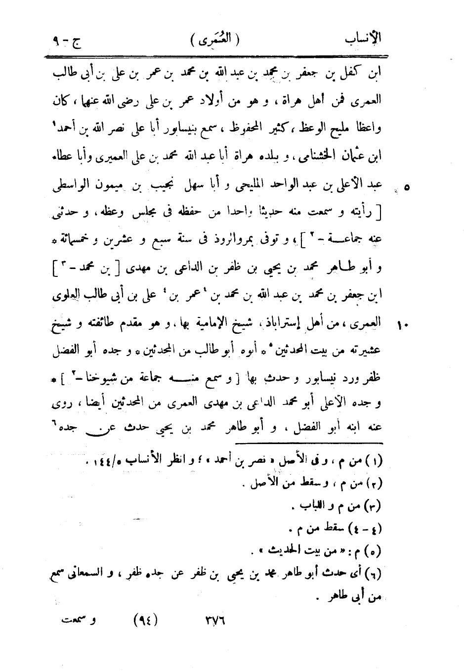 ابن كفل بن جعفر بن محمد بن عبد الله بن محمد بن عمر بن على بن أبى طالب العمرى فمن أهل هراة، وهو من أولاد عمر بن على رضى الله عنهما، كان واعظا مليح الوعظ، كثير المحفوظ، سمع بنيسابور أبا على نصر الله بن أحمد [1] ابن عثمان الخشنامى، وببلده هراة أبا عبد الله محمد بن على العميري وأبا عطاء عبد الأعلى بن عبد الواحد المليحي وأبا سهل نجيب بن ميمون الواسطي [رأيته وسمعت منه حديثا واحدا من حفظه في مجلس وعظه، وحدثني عنه جماعة-[2]] ، وتوفى بمروالروذ في سنة سبع وعشرين وخمسمائة وأبو طاهر محمد بن يحيى بن ظفر بن الداعي بن مهدي [بن محمد-[3]] ابن جعفر بن محمد بن عبد الله بن محمد بن [4] عمر بن [4] على بن أبى طالب العلويّ العمرى، من أهل أستراباذ، شيخ الإمامية بها، وهو مقدم طائفته وشيخ عشيرته من بيت المحدثين [5] أبوه أبو طالب من المحدثين وجده أبو الفضل ظفر ورد نيسابور وحدث بها [وسمع منه جماعة من شيوخنا-[2]] وجده الأعلى أبو محمد الداعي بن مهدي العمرى من المحدثين أيضا، روى عنه ابنه أبو الفضل، وأبو طاهر محمد بن يحيى حدث عن جده [6]