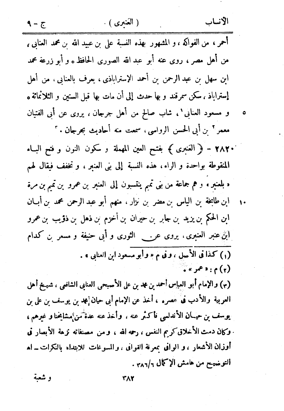 بفتح العين المهملة وسكون النون وفتح الباء المنقوطة بواحدة والراء، هذه النسبة إلى بنى العنبر، وتخفف فيقال لهم «بلعنبر» وهم جماعة من بنى تميم ينتسبون إلى العنبر بن عمرو بن تميم بن مرة ابن طابخة بن الياس بن مضر بن نزار، منهم أبو عبد الرحمن محمد بن أبان ابن الحكم بن يزيد بن جابر بن حيران بن أخزم بن ذهل بن ذؤيب بن عمرو ابن عنبر العنبري، يروى عن الثوري وأبى حنيفة ومسعر بن كدام