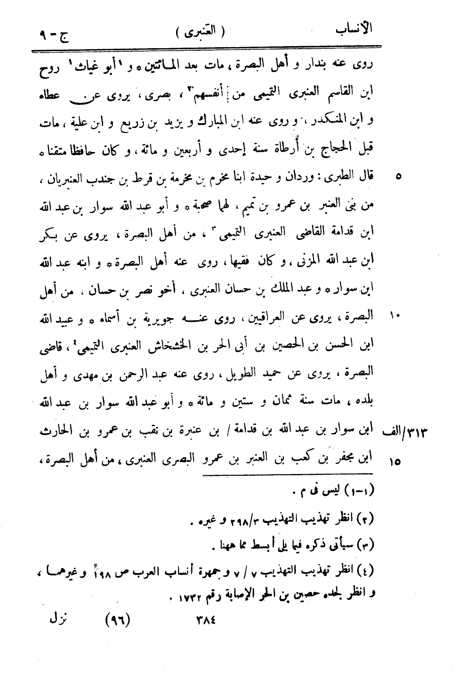 روى عنه بندار وأهل البصرة، مات بعد المائتين و [1] أبو غياث [1] روح ابن القاسم العنبري التميمي من أنفسهم [2] ، بصرى، يروى عن عطاء وابن المنكدر، وروى عنه ابن المبارك ويزيد بن زريع وابن علية، مات قبل الحجاج بن أرطاة سنة إحدى وأربعين ومائة، وكان حافظا متقنا قال الطبري: وردان وحيدة ابنا مخرم بن مخرمة بن قرط بن جندب العنبريان، من بنى العنبر بن عمرو بن تميم، لهما صحبة وأبو عبد الله سوار بن عبد الله ابن قدامة القاضي العنبري التميمي [3] ، من أهل البصرة، يروى عن بكر ابن عبد الله المزني، وكان فقيها، روى عنه أهل البصرة وابنه عبد الله ابن سوار وعبد الملك بن حسان العنبري، أخو نصر بن حسان، من أهل البصرة، يروى عن العراقيين، روى عنه جويرية بن أسماء وعبيد الله ابن الحسن بن الحصين بن أبى الحر بن الخشخاش العنبري التميمي [4] ، قاضى البصرة، يروى عن حميد الطويل، روى عنه عبد الرحمن بن مهدي وأهل بلده، مات سنة ثمان وستين ومائة وأبو عبد الله سوار بن عبد الله 313/ ألف ابن سوار بن عبد الله بن قدامة/ بن عنبرة بن نقب بن عمرو بن الحارث ابن مجفر بن كعب بن العنبر بن عمرو البصري العنبري، من أهل البصرة،